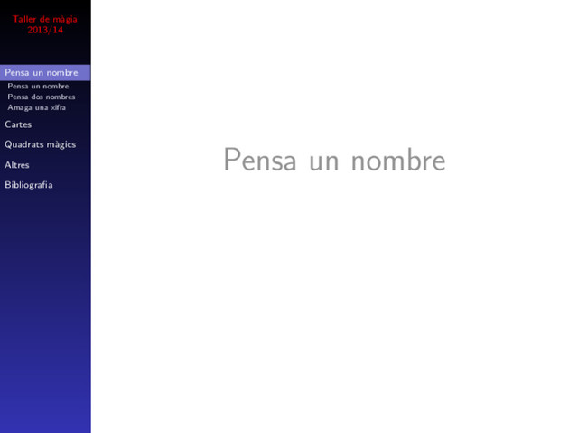 nombre Pensa dos nombres Amaga una xifra Cartes Quadrats m` agics Altres Bibliografia Pensa un nombre . . . Pensa un nombre A entre 1 i 50, i l’escrius en un rac´ o de la pissarra Ara jo em gir d’esquena a la pissarra, i tu penses un nombre B entre 51 i 100 i l’escrius a l’altra punta de la pissarra Suma-li 99 − A Esborra la primera xifra del resultat i suma-la al que queda Resta aquest resultat del nombre B que havies escrit al comen¸ cament Qu` e d´ ona?