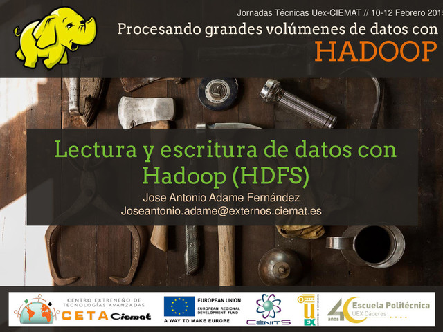 exactamente igual que hacerlo en tu ordenador personal. • HDFS esta diseñado para almacenar ficheros de gran tamaño. Fichero mayores de 500 MB es lo normal. • Los datos se almacenan en HDFS según el patrón: “Write one, read often”. Lo normal es no modificar el contenido de los ficheros y si hay que añadir se hace al final del mismo.
