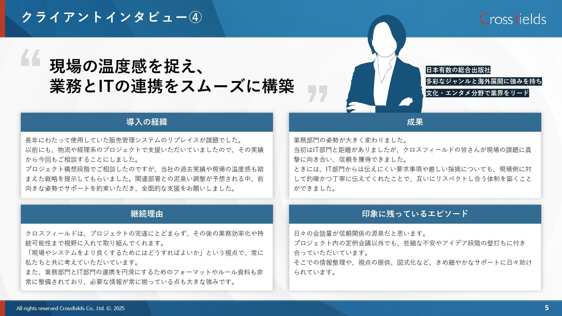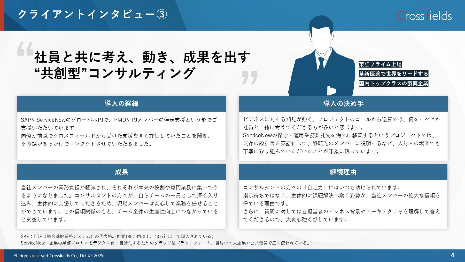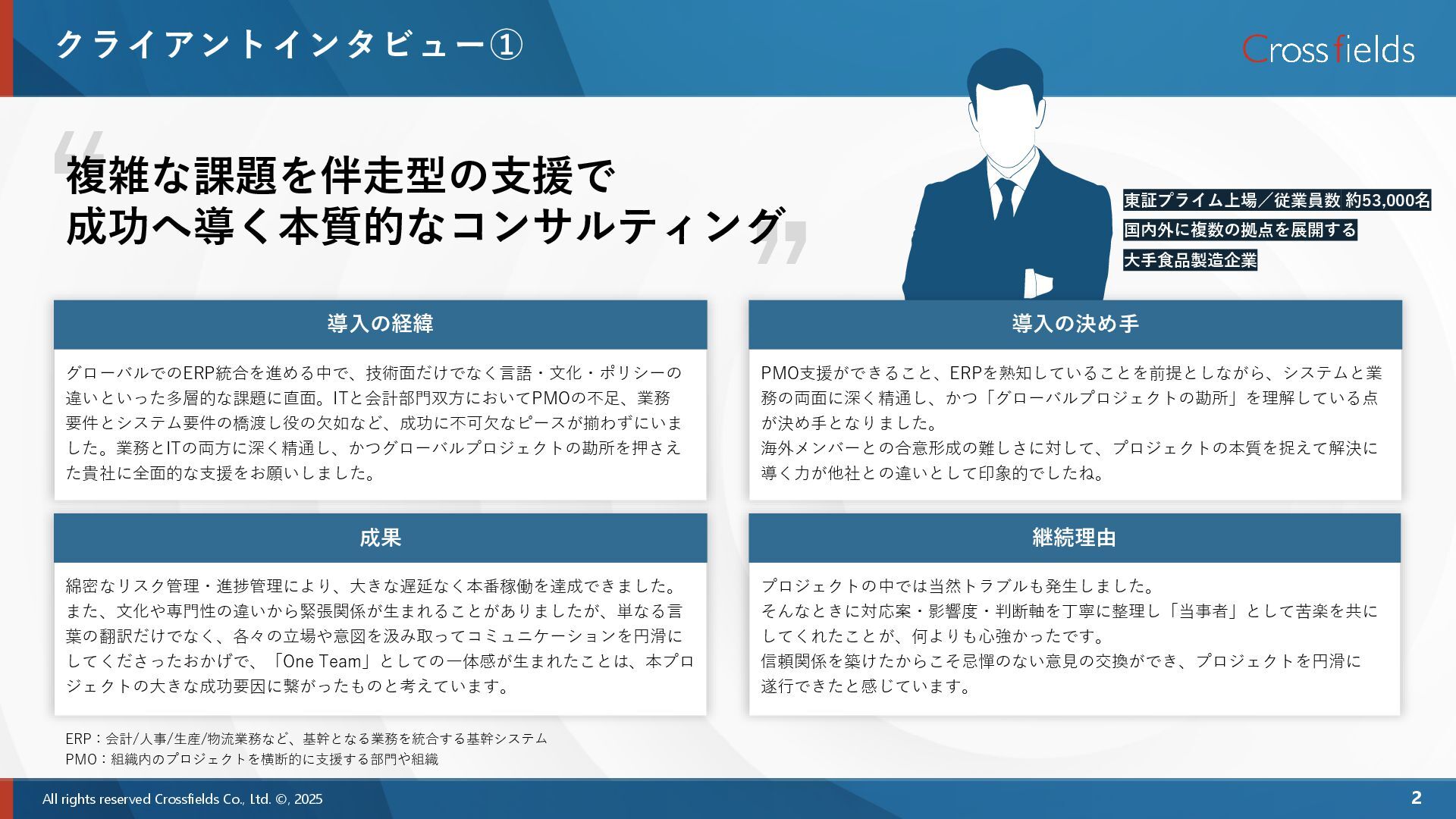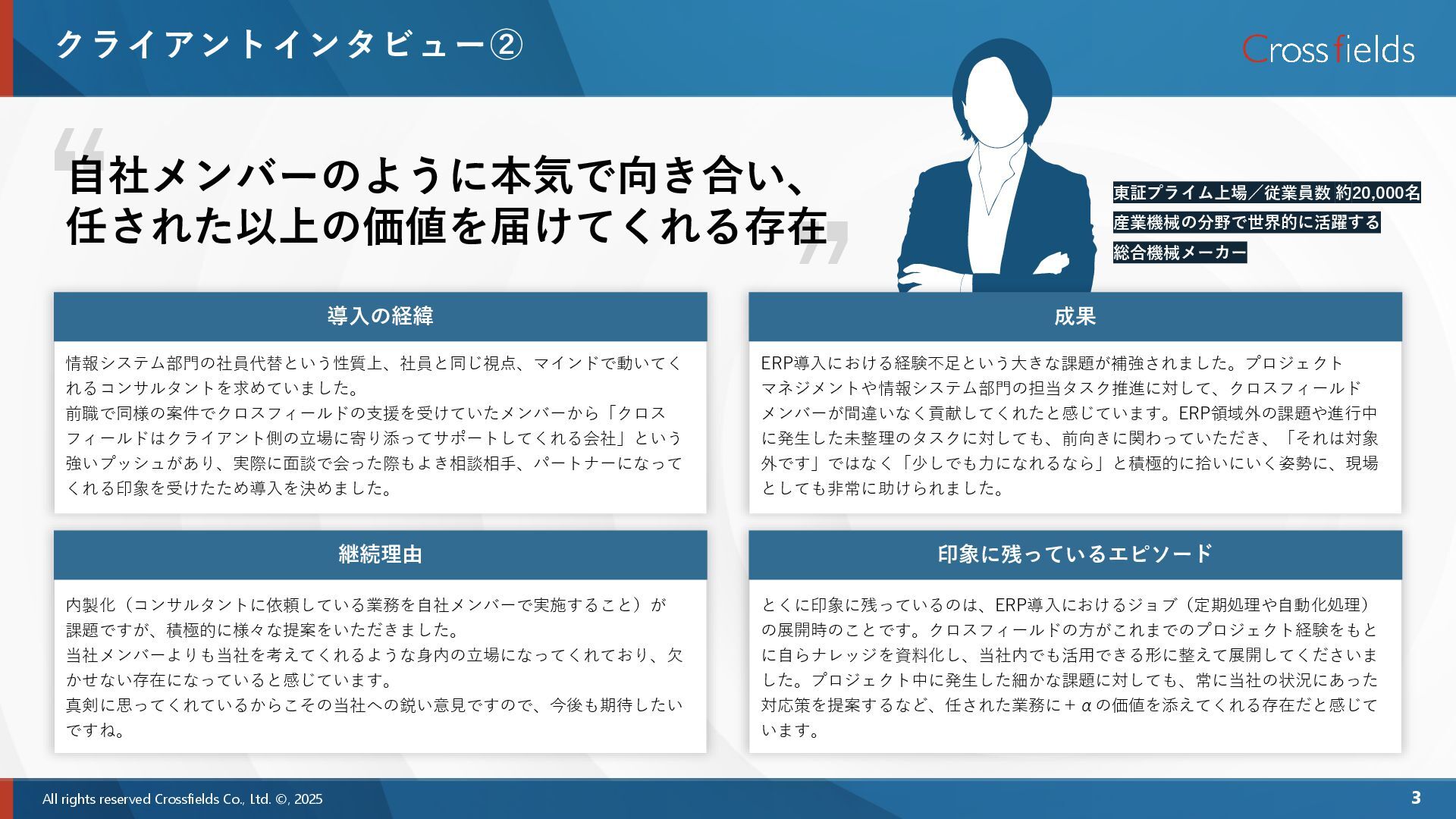 導入の経緯 導入の経緯 導入の経緯 成果 ERP導入における経験不足という大きな課題が補強されました。プロジェクト マネジメントや情報システム部門の担当タスク推進に対して、クロスフィールド メンバーが間違いなく貢献してくれたと感じています。ERP領域外の課題や進行中 に発生した未整理のタスクに対しても、前向きに関わっていただき、「それは対象 外です」ではなく「少しでも力になれるなら」と積極的に拾いにいく姿勢に、現場 としても非常に助けられました。 情報システム部門の社員代替という性質上、社員と同じ視点、マインドで動いてく れるコンサルタントを求めていました。 前職で同様の案件でクロスフィールドの支援を受けていたメンバーから「クロス フィールドはクライアント側の立場に寄り添ってサポートしてくれる会社」という 強いプッシュがあり、実際に面談で会った際もよき相談相手、パートナーになって くれる印象を受けたため導入を決めました。 導入の経緯 内製化(コンサルタントに依頼している業務を自社メンバーで実施すること)が 課題ですが、積極的に様々な提案をいただきました。 当社メンバーよりも当社を考えてくれるような身内の立場になってくれており、欠 かせない存在になっていると感じています。 真剣に思ってくれているからこその当社への鋭い意見ですので、今後も期待したい ですね。 継続理由 とくに印象に残っているのは、ERP導入におけるジョブ(定期処理や自動化処理) の展開時のことです。クロスフィールドの方がこれまでのプロジェクト経験をもと に自らナレッジを資料化し、当社内でも活用できる形に整えて展開してくださいま した。プロジェクト中に発生した細かな課題に対しても、常に当社の状況にあった 対応策を提案するなど、任された業務に+αの価値を添えてくれる存在だと感じて います。 印象に残っているエピソード “ ” 自社メンバーのように本気で向き合い、 任された以上の価値を届けてくれる存在 東証プライム上場/従業員数 約20,000名 産業機械の分野で世界的に活躍する 総合機械メーカー