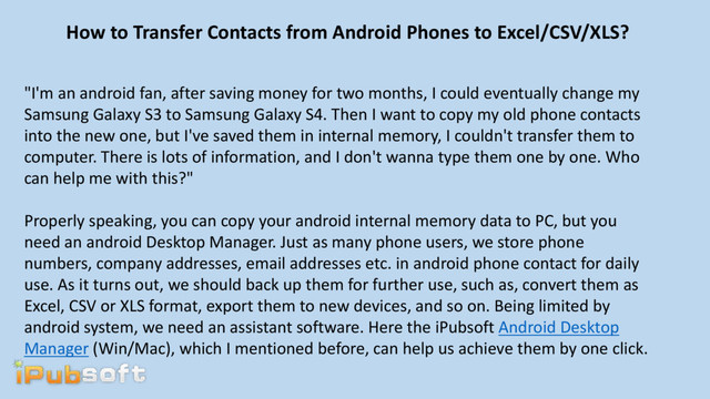 an android fan, after saving money for two months, I could eventually change my Samsung Galaxy S3 to Samsung Galaxy S4. Then I want to copy my old phone contacts into the new one, but I've saved them in internal memory, I couldn't transfer them to computer. There is lots of information, and I don't wanna type them one by one. Who can help me with this?" Properly speaking, you can copy your android internal memory data to PC, but you need an android Desktop Manager. Just as many phone users, we store phone numbers, company addresses, email addresses etc. in android phone contact for daily use. As it turns out, we should back up them for further use, such as, convert them as Excel, CSV or XLS format, export them to new devices, and so on. Being limited by android system, we need an assistant software. Here the iPubsoft Android Desktop Manager (Win/Mac), which I mentioned before, can help us achieve them by one click.
