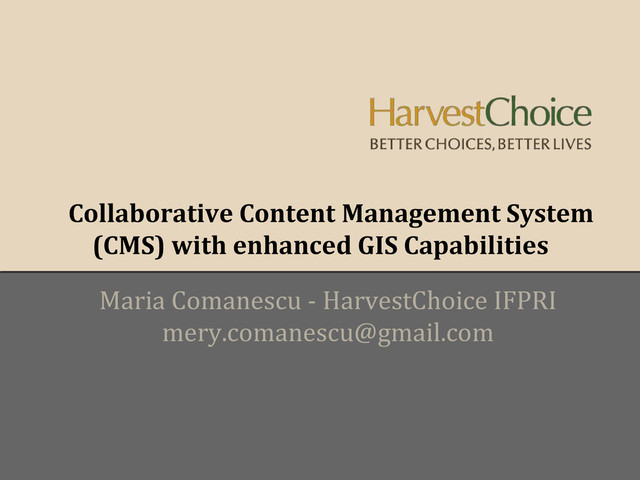 maintained - 25.000+ developers worldwide • 20.000+ extensions/modules (eg: blog capability, photo gallery, email notifications, content display, etc) OpenLayers • Open source JavaScript library capable of adding, maintaining and displaying geospatial information • Well integrated with Drupal 4 of 18 Maria Comanescu @ HarvestChoice