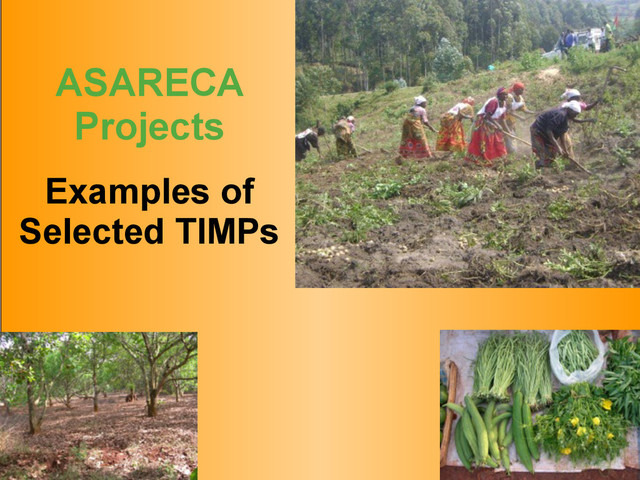 varieties (ASARECA T1; ASARECA W2, ASARECA AG3 and ASARECA AG4) ! ② Improved sorghum varieties combined with H20 harvesting techs (WAHI; MTAMA 1, GADAM & MARCIA) ! ③ High yielding bush beans varieties (RWK 10; RWR 1180) ! ④ Small scale irrigation & manure application for vegetable & fodder production ! ⑤ Soil & water management technologies for drought tolerant maize varieties (DT Maize) ! ⑥ Feed & water conservation TIMPs for semi-arid areas.