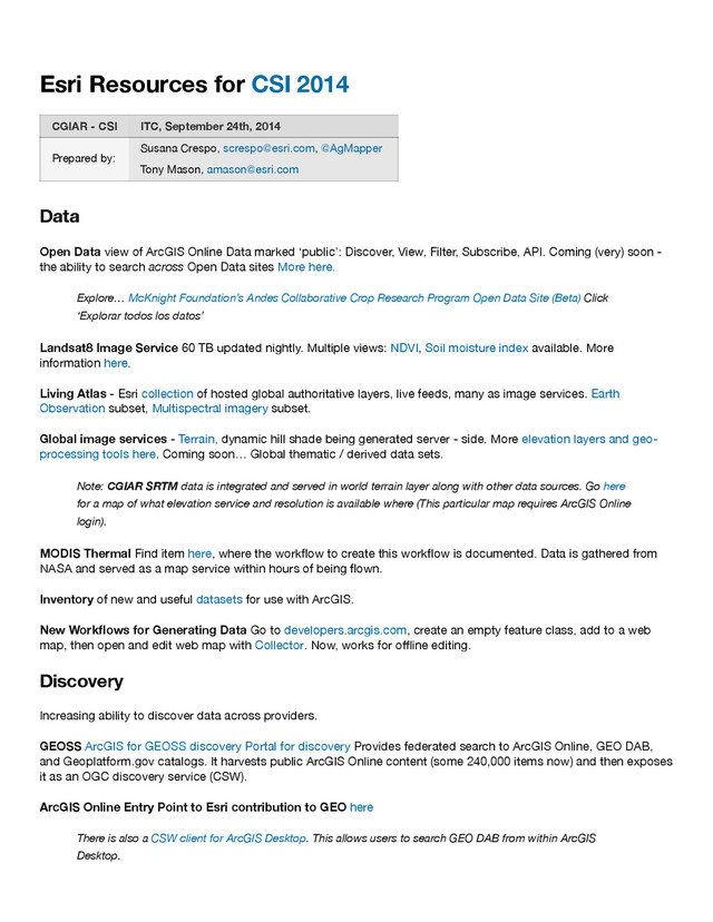 [email protected] Data Open Data view of ArcGIS Online Data marked ‘public’: Discover, View, Filter, Subscribe, API. Coming (very) soon - the ability to search across Open Data sites More here. Explore… McKnight Foundation’s Andes Collaborative Crop Research Program Open Data Site (Beta) Click ‘Explorar todos los datos’ Landsat8 Image Service 60 TB updated nightly. Multiple views: NDVI, Soil moisture index available. More information here. Living Atlas - Esri collection of hosted global authoritative layers, live feeds, many as image services. Earth Observation subset, Multispectral imagery subset. Global image services - Terrain, dynamic hill shade being generated server - side. More elevation layers and geo- processing tools here. Coming soon… Global thematic / derived data sets. Note: CGIAR SRTM data is integrated and served in world terrain layer along with other data sources. Go here for a map of what elevation service and resolution is available where (This particular map requires ArcGIS Online login). MODIS Thermal Find item here, where the workflow to create this workflow is documented. Data is gathered from NASA and served as a map service within hours of being flown. Inventory of new and useful datasets for use with ArcGIS. New Workflows for Generating Data Go to developers.arcgis.com, create an empty feature class, add to a web map, then open and edit web map with Collector. Now, works for offline editing. Discovery Increasing ability to discover data across providers. GEOSS ArcGIS for GEOSS discovery Portal for discovery Provides federated search to ArcGIS Online, GEO DAB, and Geoplatform.gov catalogs. It harvests public ArcGIS Online content (some 240,000 items now) and then exposes it as an OGC discovery service (CSW). ArcGIS Online Entry Point to Esri contribution to GEO here There is also a CSW client for ArcGIS Desktop. This allows users to search GEO DAB from within ArcGIS Desktop.