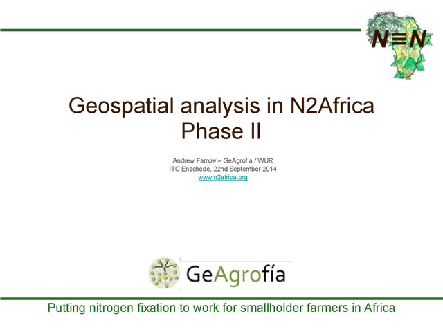 N2Africa Phase II Main partners: WUR, IITA, ILRI, AGRA ! N2Africa will build sustainable, long-term partnerships to enable African smallholder farmers to benefit from symbiotic N2-fixation by grain legumes through effective production technologies including inoculants and fertilizers. ! Activities will focus on: • Cowpea, groundnut and soybean in Ghana and Nigeria • Common bean, cowpea, groundnut and soybean in Tanzania and Uganda • Common bean, soybean, chickpea and faba bean in Ethiopia