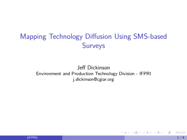 to cell phone users in most developing countries around the world Pros: easy access to subjects, cheaper than using enumerators, rapid turnaround time, relatively "clean" data Cons: heavy reliance multiple choice questions, strict formatting guidelines, poor geographic targeting, very simplistic skip logic patterns, tough to verify (discuss) (could we have followed up the survey with a phone call? can we call the ones that are weird outliers and ask some questions?) (IFPRI) 3 / 9