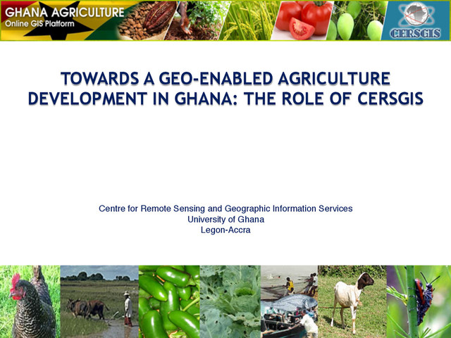 GIS Portal for Ghana’s agriculture for retrieving datasets ! ! ❖ Harmonizing agriculture projects datasets for easy referencing and access even after projects lifespan (AGRA, TIPCEE, ADVANCE, etc) ! ! ❖ Developing thematic maps to support decision making by value chain actors in the sector(Agriculture Project Intervention Maps, etc) ! ! ❖ Visualization and access of agriculture related statistics (Production, Market Prices, etc)