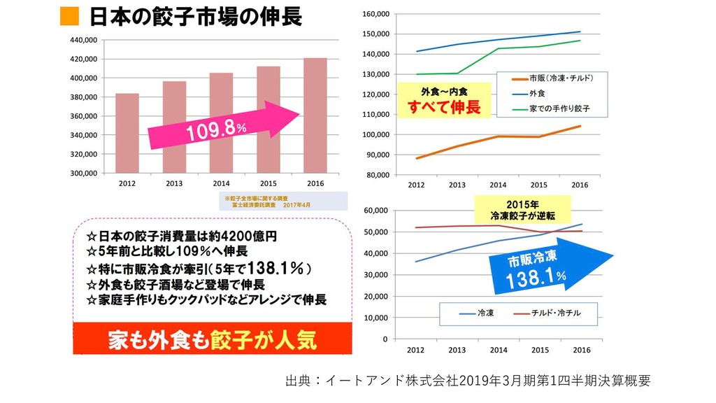 餃子は外食市場が大きいのですが、冷凍餃子もかなりマーケットを大きくなってきています。