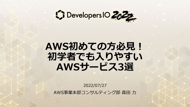 AWS初めての⽅必⾒︕ 初学者でも⼊りやすい AWSサービス3選 2022/07/27 AWS事業本部コンサルティング部 森⽥ ⼒