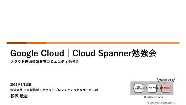 2022年4月18日のクラウド技術情報共有コミュニティ勉強会の資料です。本セッションでは、Google CloudのデータベースサービスであるCloud Spannerについて、最初の一歩編として概要ならびに他のデータベースサービスとの使い分けについて紹介します。