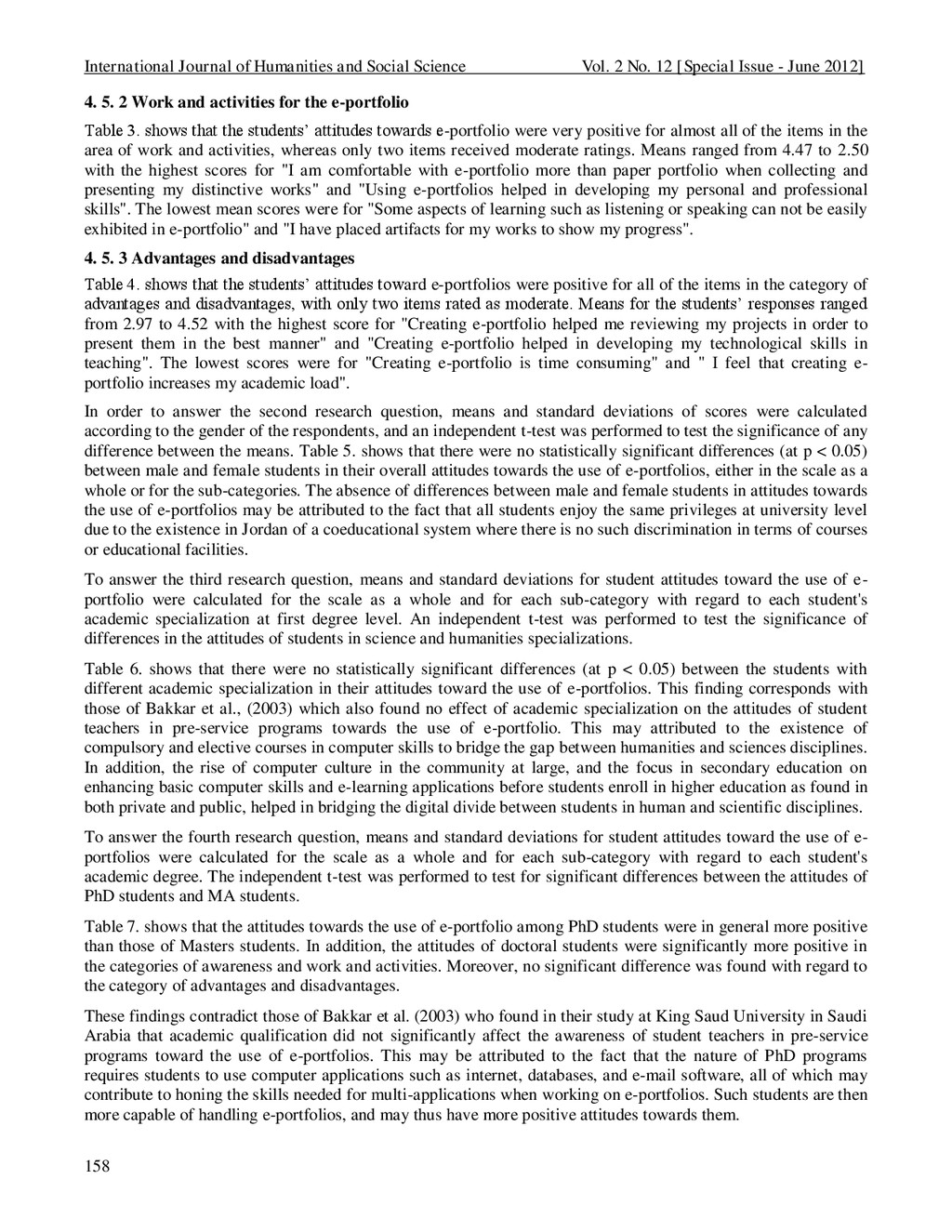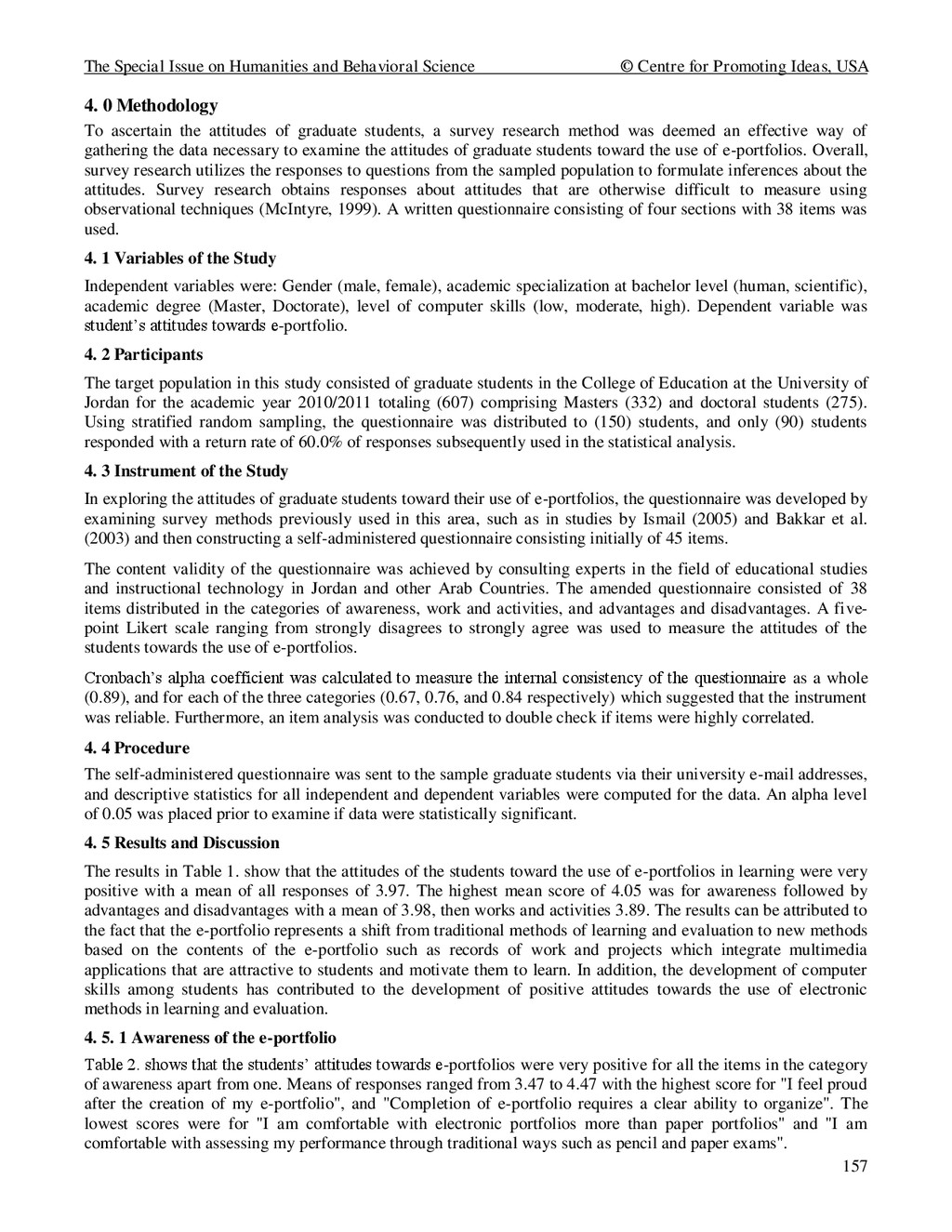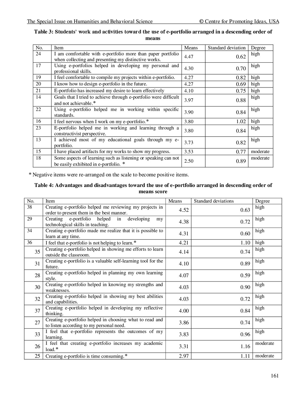 for Promoting Ideas, USA 159 To answer the fifth research question, means and standard deviations for the students’ attitudes towards the use of e-portfolio were calculated for the scale as a whole and for each sub-area of the scale with regard to level of computer skills. In addition, a one-way analysis of variance (ANOVA) was conducted to find any statistically significant differences in mean scores between the students’ attitudes with regard to their level of computer skills, which were measured via using a three-point scale of low, moderate, and high. The results in Table 8. show that there are statistically significant differences in the mean scores of the students’ attitudes with regard to their level of computer skills. A one-way analysis of variance (ANOVA) was conducted to identify any statistically significant differences in the mean scores. Table 9. shows that there are significant differences for the scale as a whole and for each sub-category of the scale. The Scheffee test for comparisons was then used to determine where the differences in means lie in terms of level of computer skills. Table 10. shows that the students with moderate and high levels of computer skills had more positive attitudes than those with low levels of skills for the scale as a whole and for the awareness and advantages and disadvantages sub-categories. These differences may be attributed to the fact that students with high levels of computer skills can work on portfolios in the electronic rather than paper version by more readily employing some of the information technology applications required, such as using, organizing, storing, designing, and editing multimedia files. In addition, their skills help them in constructing websites and taking into account the principles of electronic design while working to certain technological standards, which will be reflected in their positive attitudes towards e- portfolios. 5. 0 Recommendations In the light of the findings of this study, the following recommendations can be made: 1. Further exploration of the use of e-portfolios as an alternative method of assessment is needed, since this method is now widely used in American higher education and has proved its effectiveness and usefulness. 2. Training courses should be held for graduate students and faculty members on how to integrate e-portfolios into teaching and learning. References Abdel-Moneim, A. (1997). Educational technology and educational resources. Cairo, Dar Albishri. Abdul-Aziz, H. (2008). E-learning: Philosophy, principles, tools, applications. Amman, Dar Alfikir. Al-Ahmed, N,. & Osman, S. (2006). Standards for building e-portfolio middle third-grade students as an entry point to choose the real high school. Journal of the College of Education in Ismailiah. Swiss Tunnel University, April 5. Bakkar, N., Al-Ahmed, N., Al-Bassam, M., Al-Sumairi, L., & Osman, S. (2003). Degree of awareness of the purposes of using e-portfolio by female students in pre-service teacher education programs in the College of Education, at King Saud University in Saudi Arabia. Message of the Arabian Gulf, 78, 151-159. Bakkar, N., & Al-Bassam, M. (2001). The e-portfolio is a mean of educational innovation in the twenty 21s centaury. Journal of Educational Sciences, Institution of Educational Sciences, Cairo University, 2, 143-164. Barrett, H. (2001). Electronic portfolios. Retrieved September 2, 2011, from http://electronicportfolios.org/portfolios/encyclopediaentry.htm. Barrett, H. (2000). Create your own electronic portfolio. Learning and Leading with Technology, 27(7), 14-21. Bartlett, A. (2002). Preparing preservice teachers to implement performance assessment and technology through electronic portfolios. Action in Teacher Education, 24(1), 90–97. Britten, J., Mullen, L., & Stuve, M. (2003). Program reflections on the role of longitudinal digital portfolios in the development of technology competence. The Teacher Educator, 39(2), 79–94. Czech, B., & Amber, V. (2002). What is the perceived value of creating electronic portfolios to teacher credential candidates? In C. Crawford et al. (Eds.). Proceedings of Society for Information Technology and Teacher Education International Conference (pp. 524-527). Chesapeake, VA: AACE. Curry, S., and Cruz, J. (2000). Portfolio-based teacher assessment. Thrust for Educational Leadership, 29(3), 34-37. Irby, B. J., & Brown, G. (2000). The career advancement portfolio. Thousand Oaks, CA: Corwin Press, Inc. Ismail, H. (2005). Perceptions of students of the college of education at the University of Qatar toward their use of e-portfolio in learning. The 10 Scientific conferences on e-learning technology and overall quality. The Egyptian Society for Technology in Education, College of Education, Ain Shams University, July 5-7.