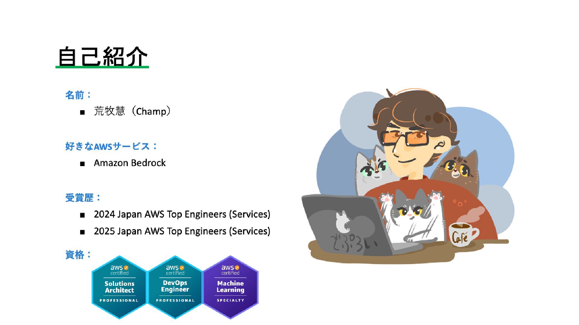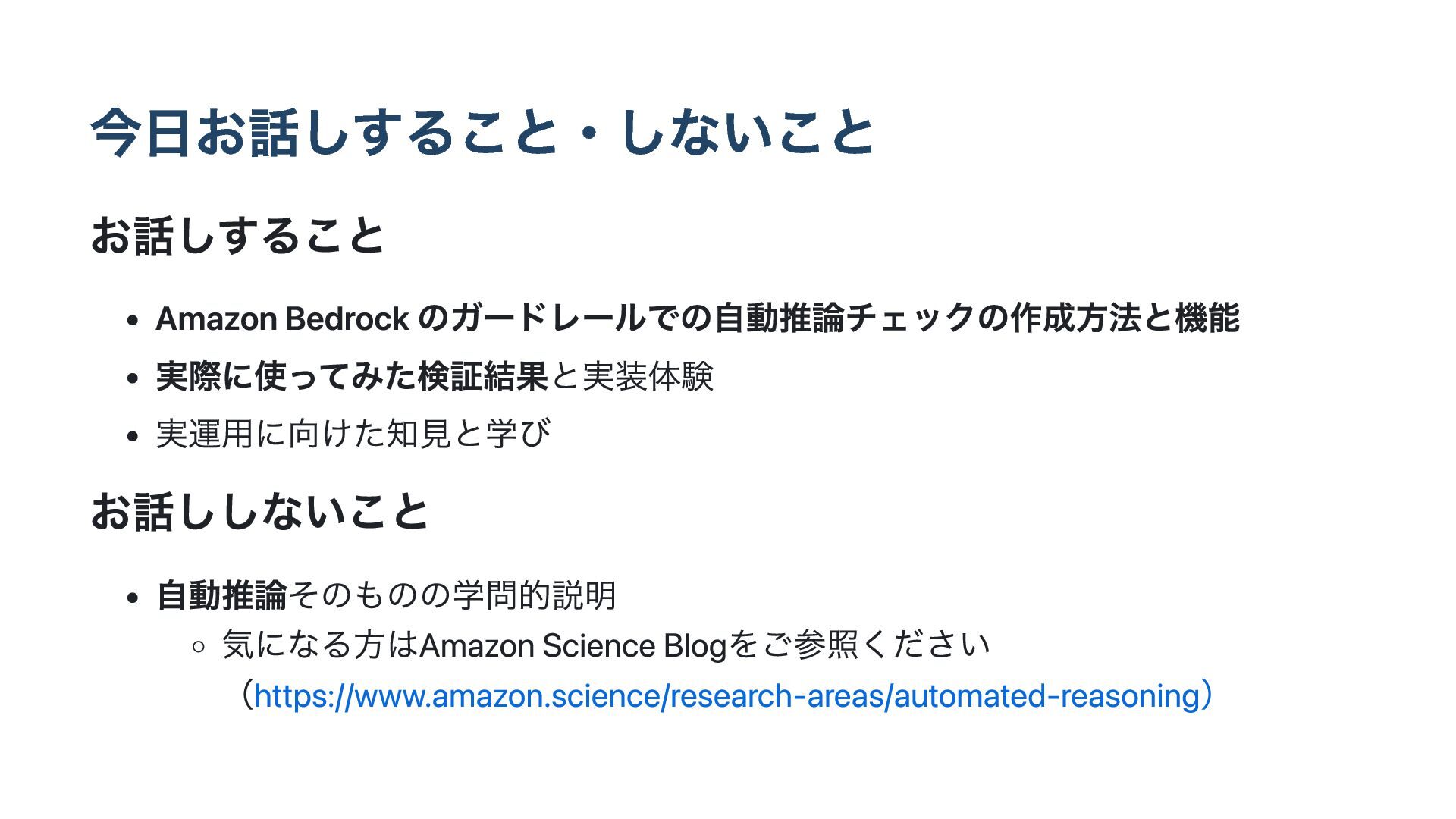 今日お話しすること・しないこと お話しすること Amazon Bedrock のガードレールでの自動推論チェックの作成方法と機能 実際に使ってみた検証結果と実装体験 実運用に向けた知見と学び お話ししないこと 自動推論そのものの学問的説明 気になる方はAmazon