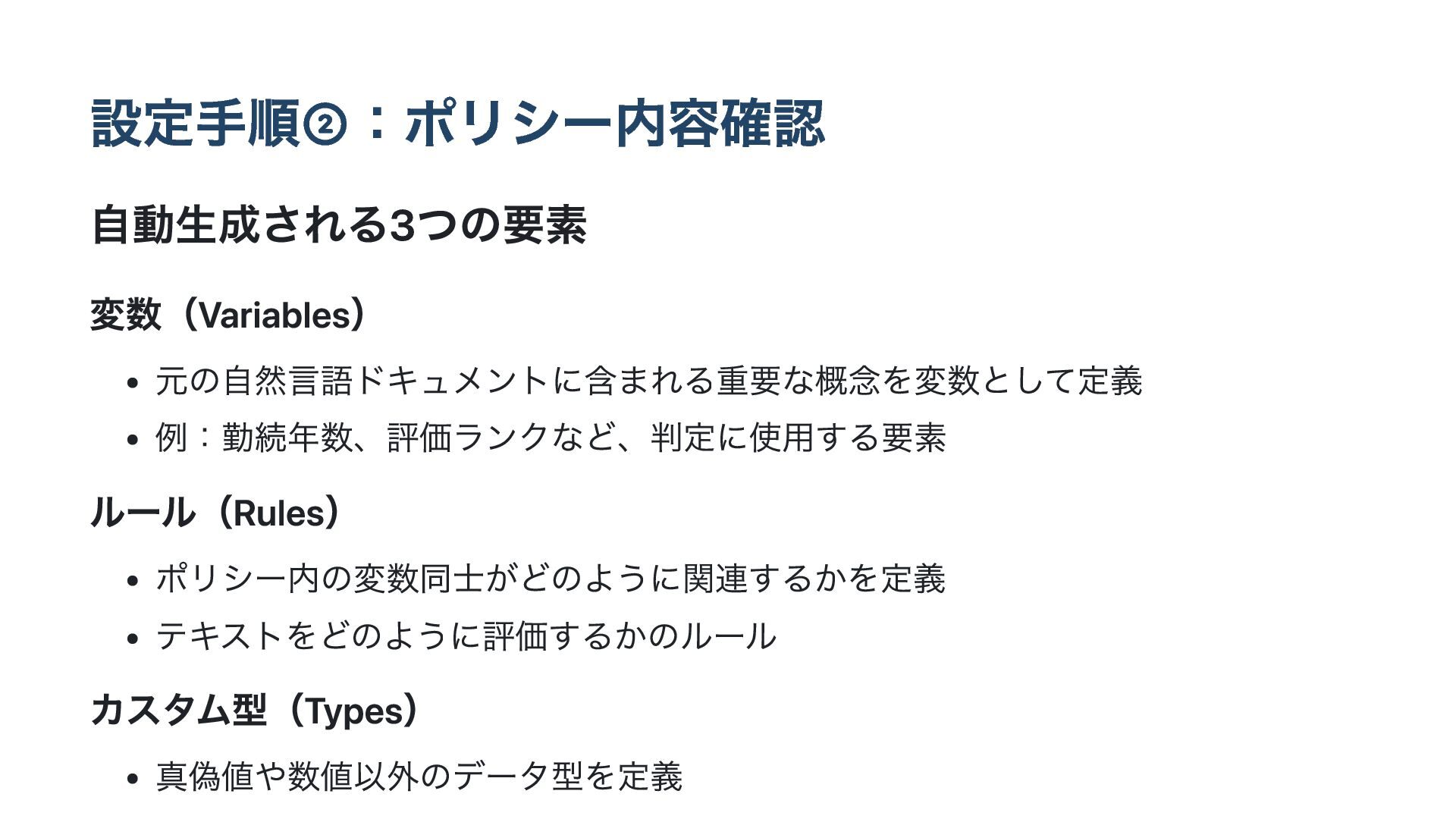 設定手順②:ポリシー内容確認 自動生成される3つの要素 変数(Variables) 元の自然言語ドキュメントに含まれる重要な概念を変数として定義 例:勤続年数、評価ランクなど、判定に使用する要素 ルール(Rules) ポリシー内の変数同士がどのように関連するかを定義 テキストをどのように評価するかのルール カスタム型(Types) 真偽値や数値以外のデータ型を定義