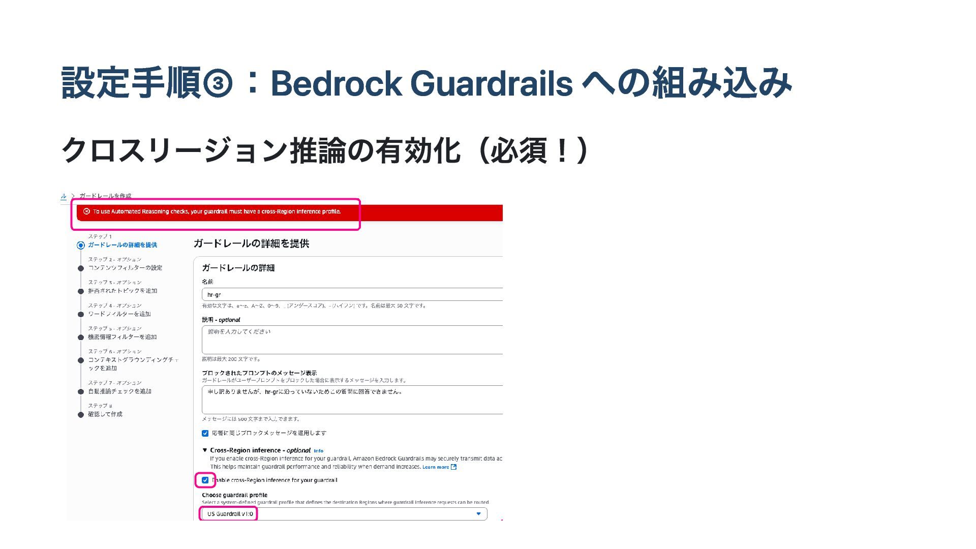 設定手順③:Bedrock Guardrails への組み込み クロスリージョン推論の有効化(必須!)