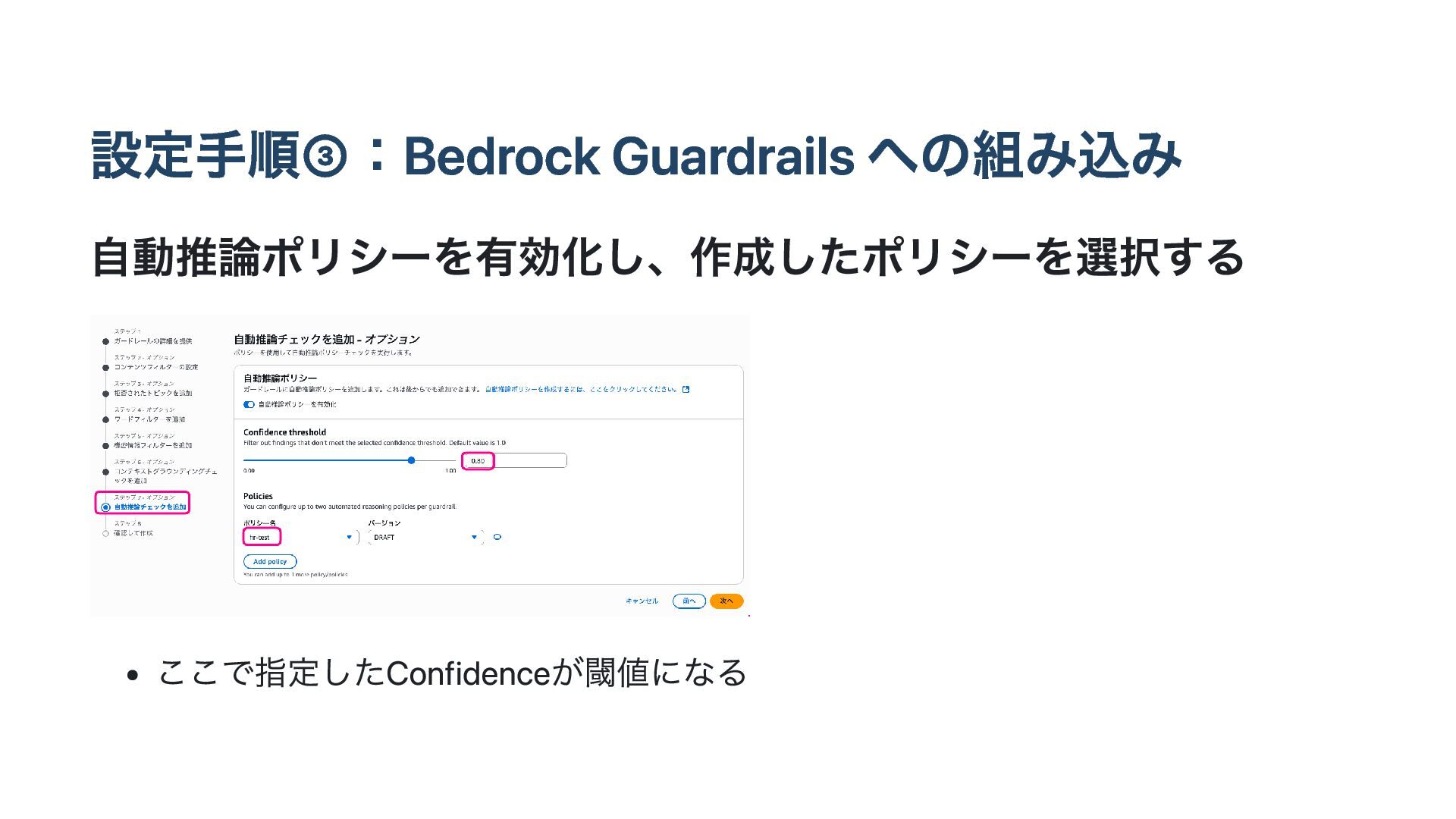 設定手順③:Bedrock Guardrails への組み込み 自動推論ポリシーを有効化し、作成したポリシーを選択する ここで指定したConfidenceが閾値になる