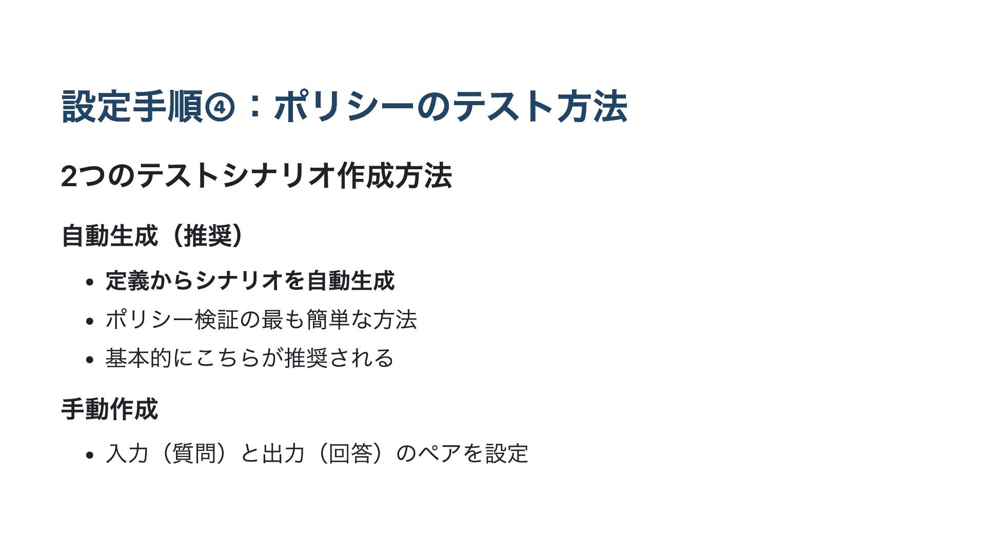 設定手順④:ポリシーのテスト方法 2つのテストシナリオ作成方法 自動生成(推奨) 定義からシナリオを自動生成 ポリシー検証の最も簡単な方法 基本的にこちらが推奨される 手動作成 入力(質問)と出力(回答)のペアを設定