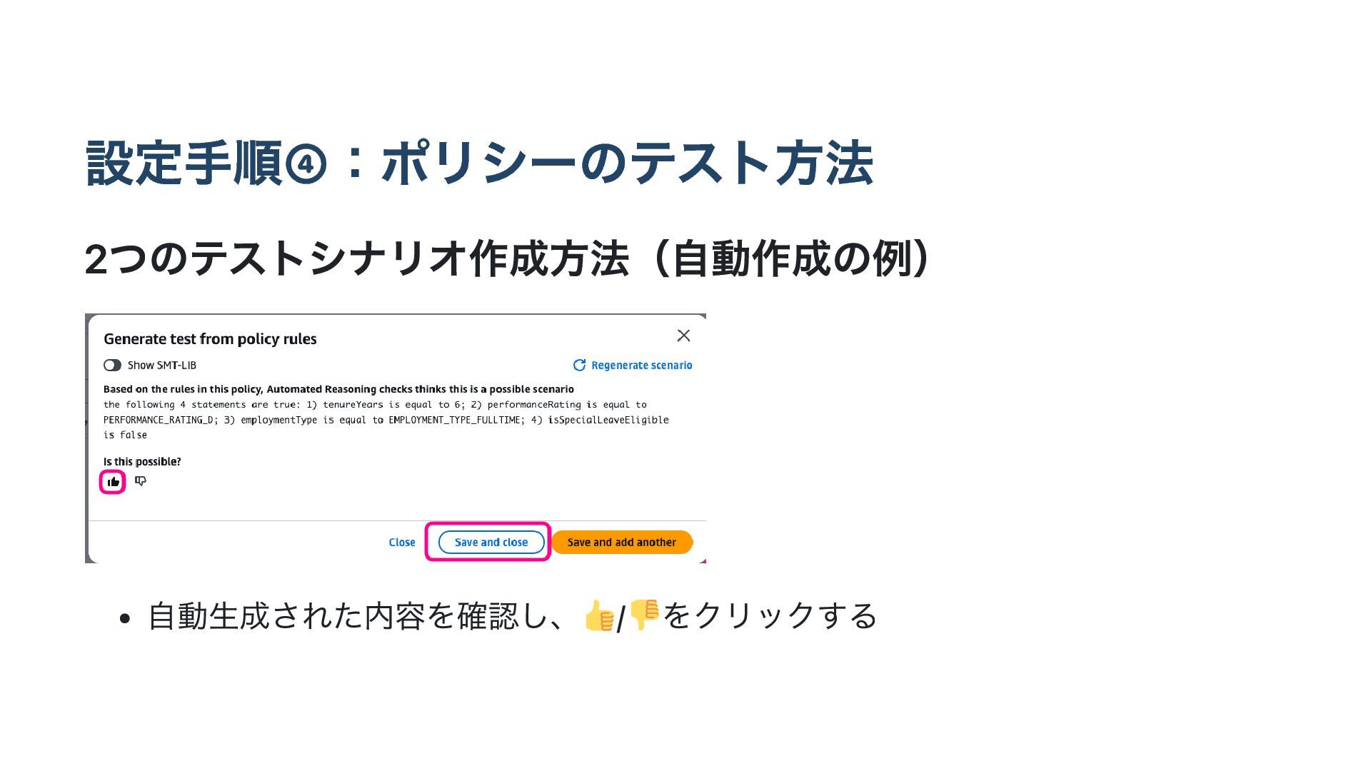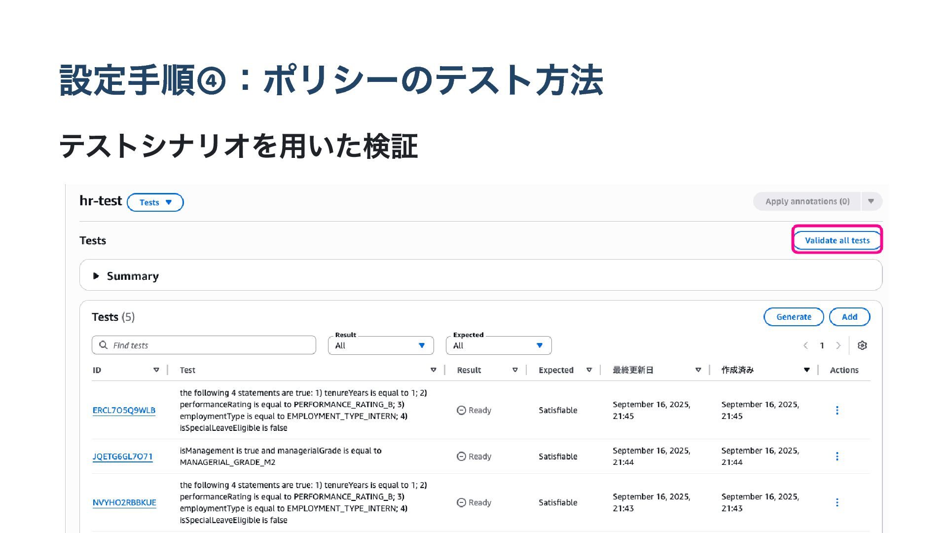 設定手順④:ポリシーのテスト方法 2つのテストシナリオ作成方法(自動作成の例) 自動生成された内容を確認し、 / をクリックする