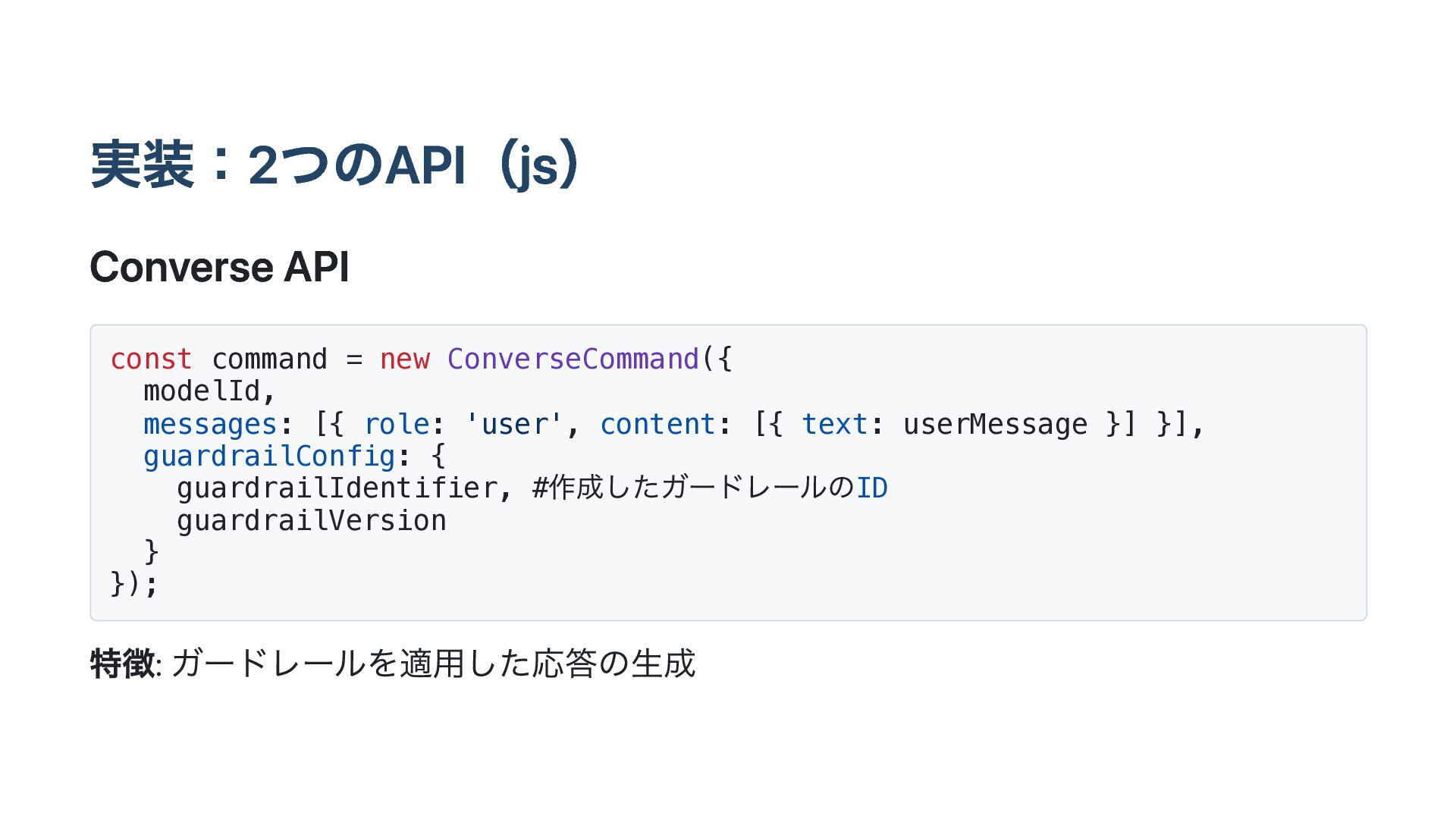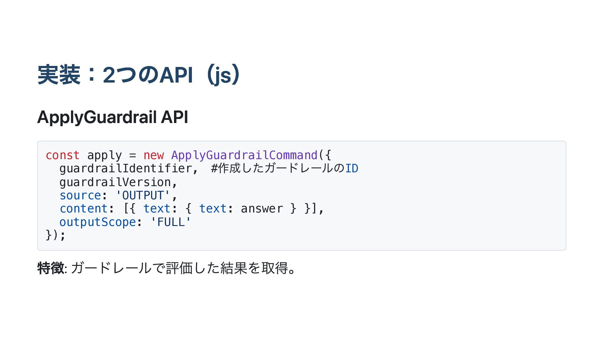 実装:2つのAPI(js) ApplyGuardrail API const apply = new ApplyGuardrailCommand({ guardrailIdentifier, #
