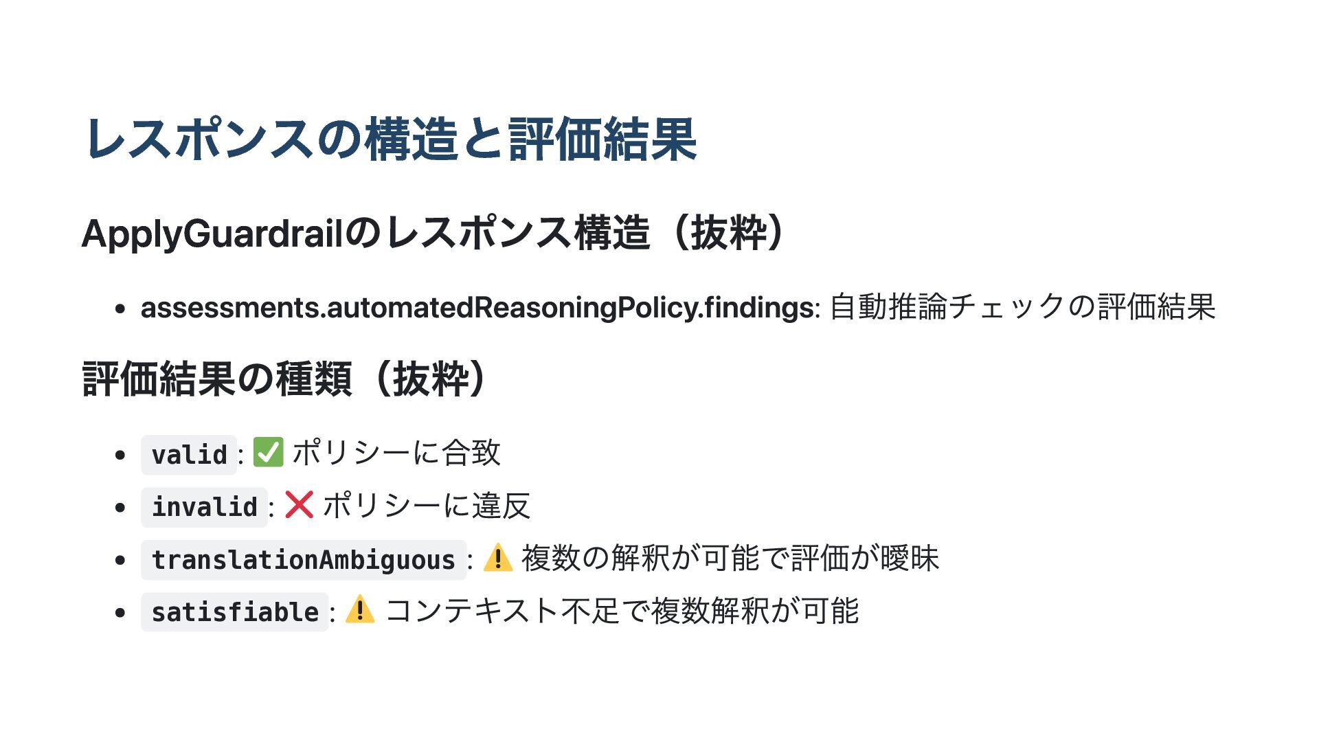レスポンスの構造と評価結果 ApplyGuardrailのレスポンス構造(抜粋) assessments.automatedReasoningPolicy.findings: 自動推論チェックの評価結果 評価結果の種類(抜粋) valid : ポリシーに合致 invalid :