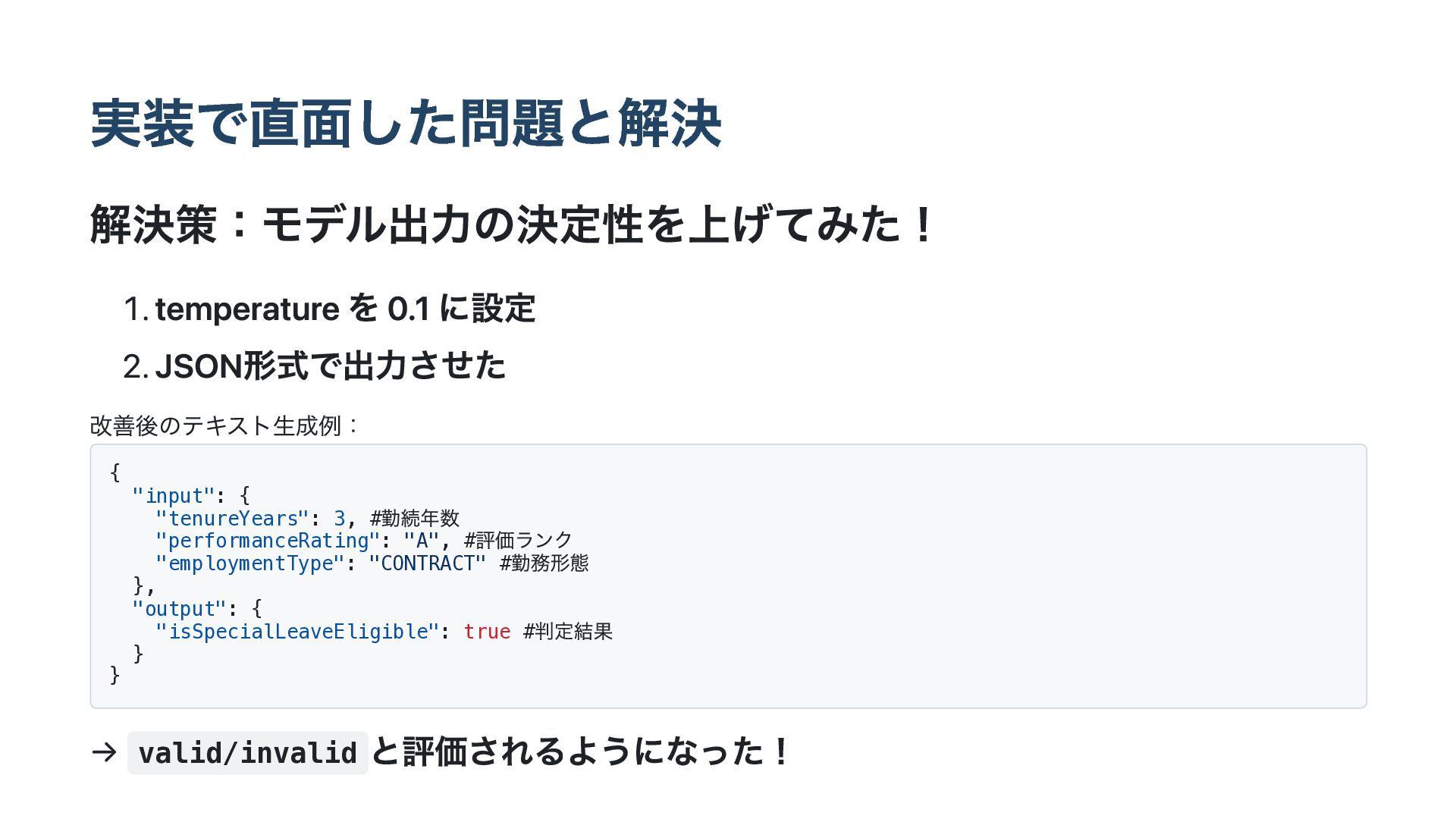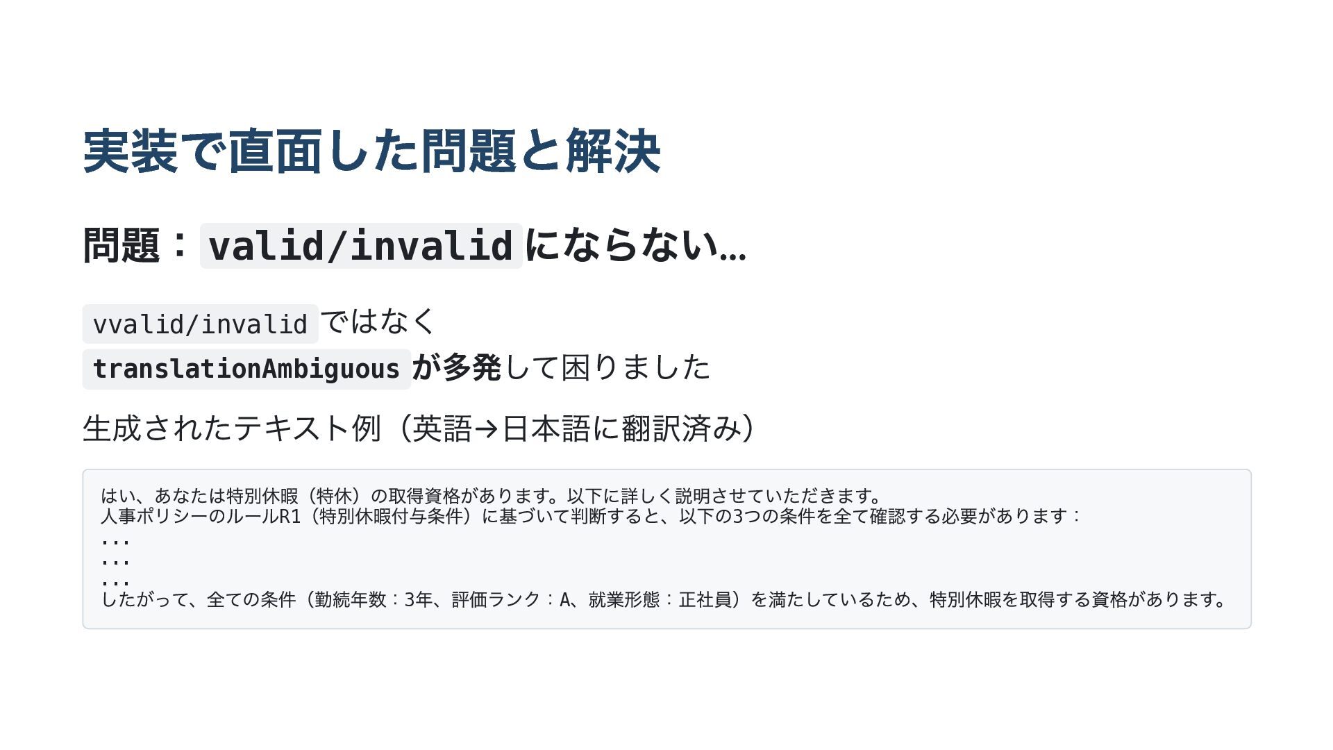 実装で直面した問題と解決 問題:valid/invalid にならない... vvalid/invalid ではなく translationAmbiguous が多発して困りました 生成されたテキスト例(英語→日本語に翻訳済み) はい、あなたは特別休暇(特休)の取得資格があります。以下に詳しく説明させていただきます。 人事ポリシーのルールR1