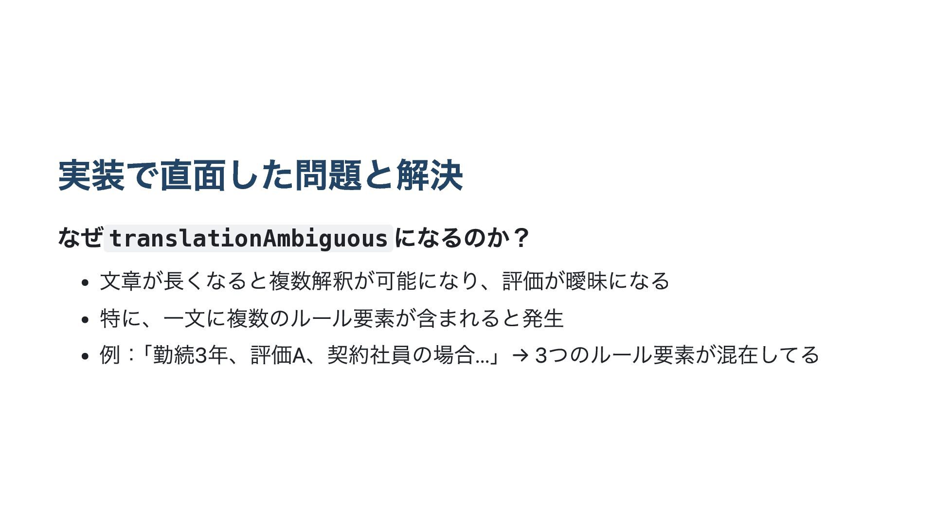 実装で直面した問題と解決 なぜtranslationAmbiguous になるのか? 文章が長くなると複数解釈が可能になり、評価が曖昧になる 特に、一文に複数のルール要素が含まれると発生 例: 「勤続3年、評価A、契約社員の場合...」→ 3つのルール要素が混在してる