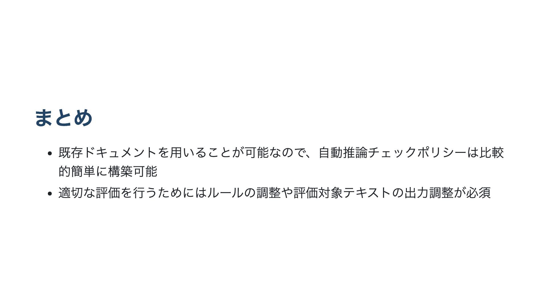 まとめ 既存ドキュメントを用いることが可能なので、自動推論チェックポリシーは比較 的簡単に構築可能 適切な評価を行うためにはルールの調整や評価対象テキストの出力調整が必須
