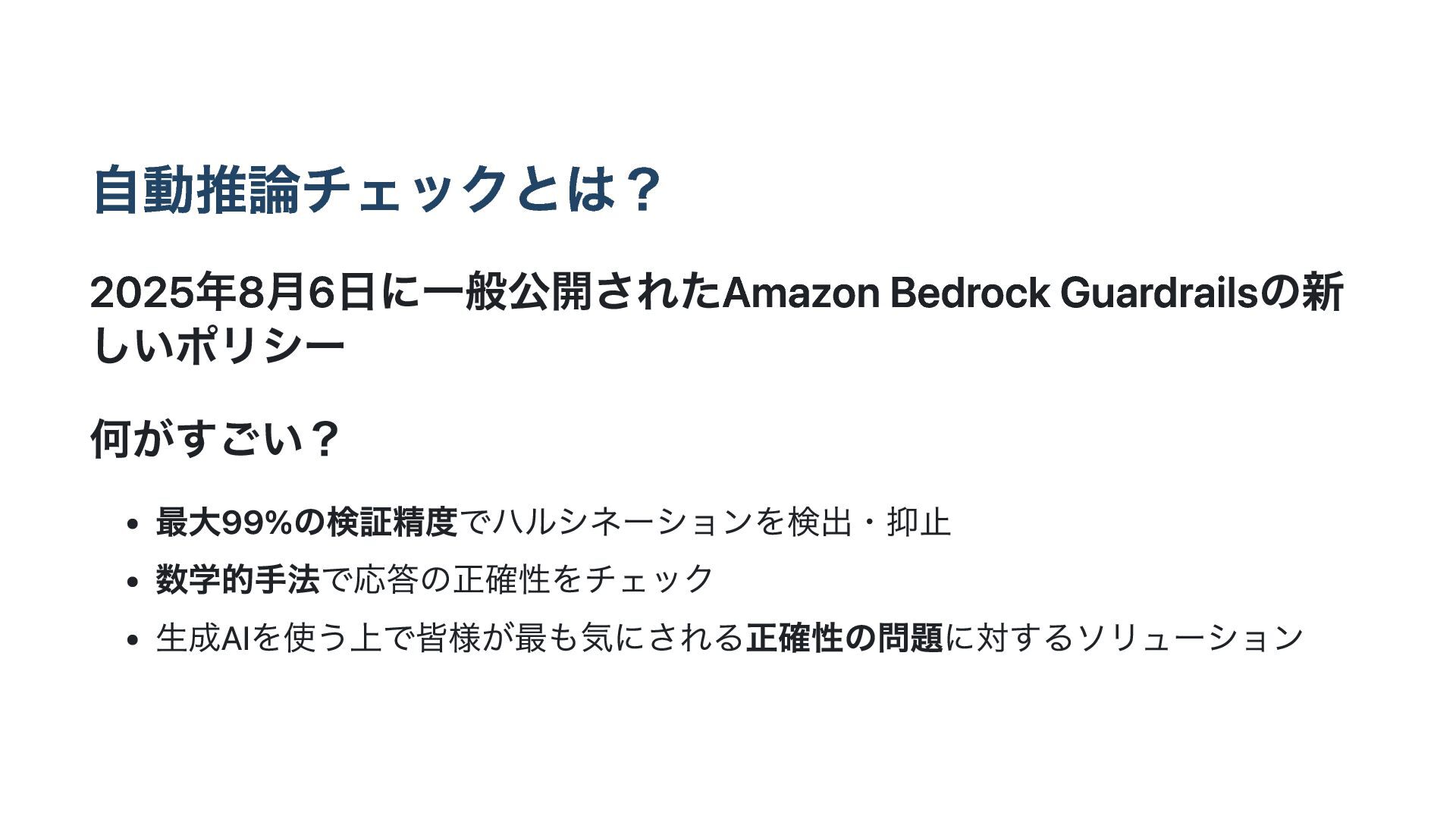 自動推論チェックとは? 2025年8月6日に一般公開されたAmazon Bedrock Guardrailsの新 しいポリシー 何がすごい? 最大99%の検証精度でハルシネーションを検出・抑止 数学的手法で応答の正確性をチェック 生成AIを使う上で皆様が最も気にされる正確性の問題に対するソリューション
