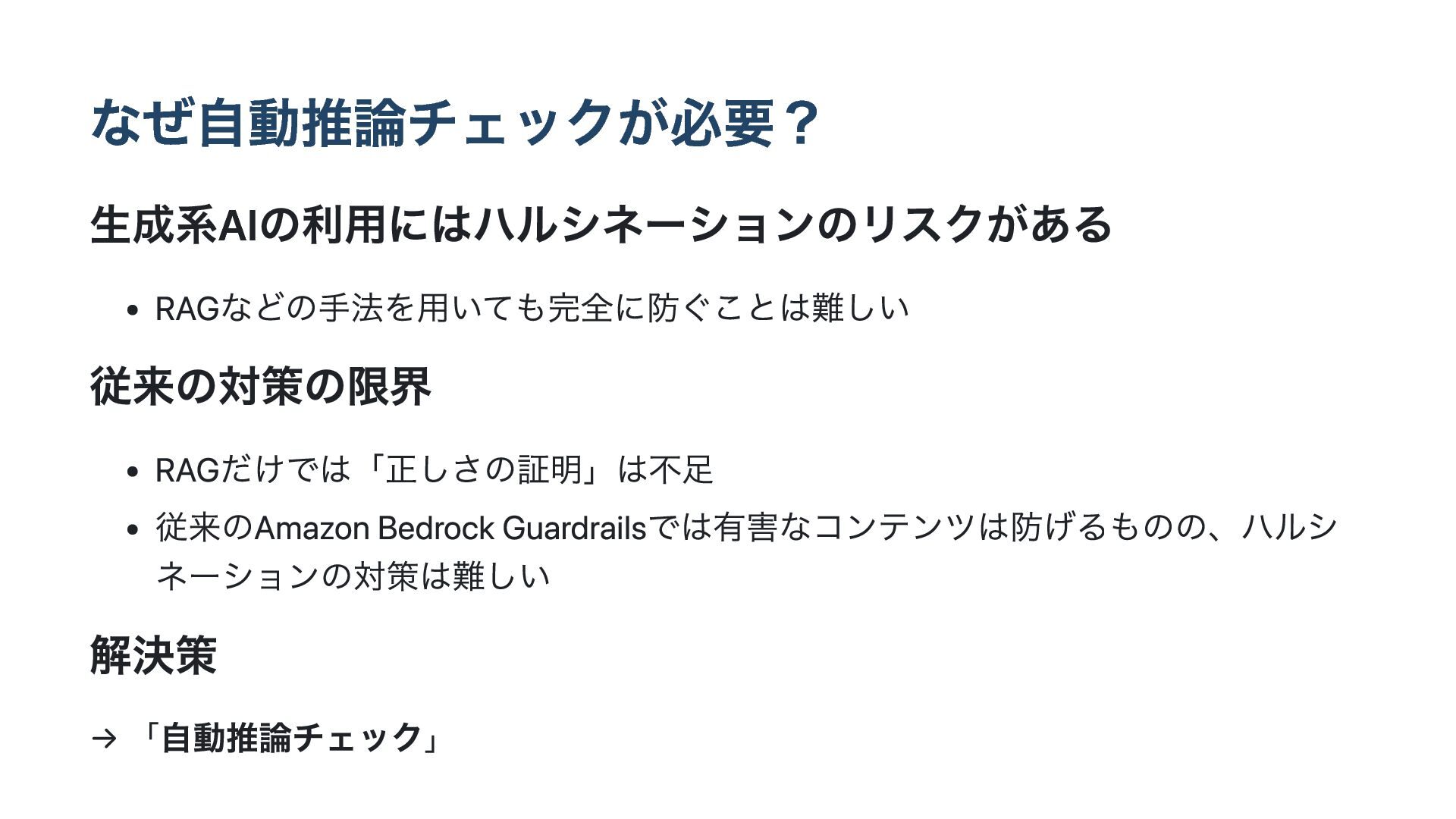 なぜ自動推論チェックが必要? 生成系AIの利用にはハルシネーションのリスクがある RAGなどの手法を用いても完全に防ぐことは難しい 従来の対策の限界 RAGだけでは「正しさの証明」は不足 従来のAmazon Bedrock Guardrailsでは有害なコンテンツは防げるものの、ハルシ ネーションの対策は難しい 解決策