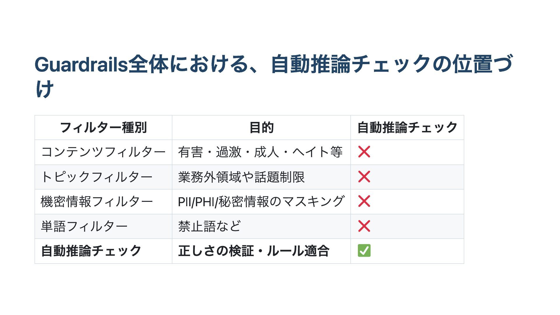 Guardrails全体における、自動推論チェックの位置づ け フィルター種別 目的 自動推論チェック コンテンツフィルター 有害・過激・成人・ヘイト等 トピックフィルター 業務外領域や話題制限 機密情報フィルター