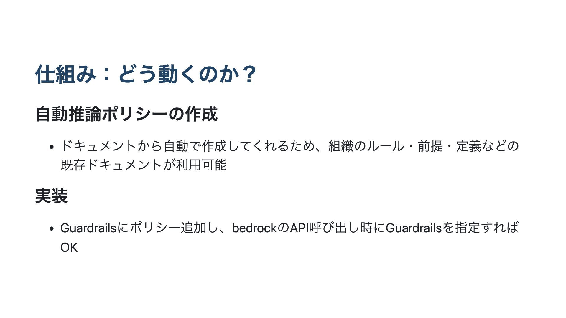 仕組み:どう動くのか? 自動推論ポリシーの作成 ドキュメントから自動で作成してくれるため、組織のルール・前提・定義などの 既存ドキュメントが利用可能 実装 Guardrailsにポリシー追加し、bedrockのAPI呼び出し時にGuardrailsを指定すれば OK