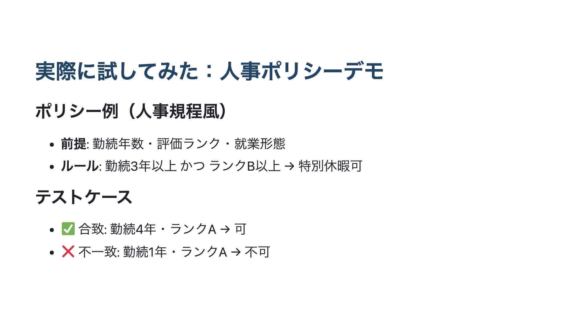実際に試してみた:人事ポリシーデモ ポリシー例(人事規程風) 前提: 勤続年数・評価ランク・就業形態 ルール: 勤続3年以上 かつ ランクB以上 → 特別休暇可