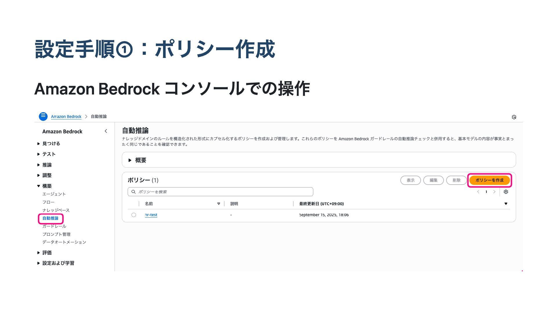 設定手順①:ポリシー作成 Amazon Bedrock コンソールでの操作