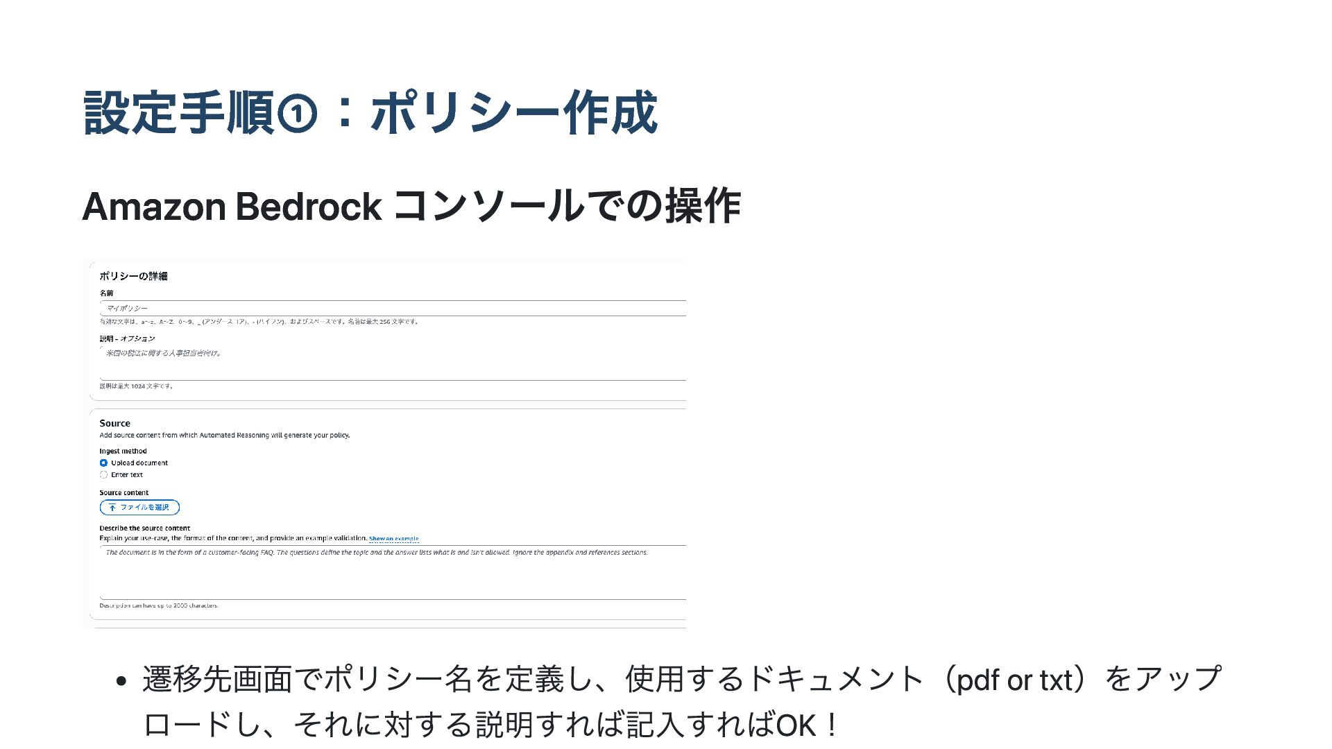 設定手順①:ポリシー作成 Amazon Bedrock コンソールでの操作 遷移先画面でポリシー名を定義し、使用するドキュメント(pdf or txt)をアップ ロードし、それに対する説明すれば記入すればOK!