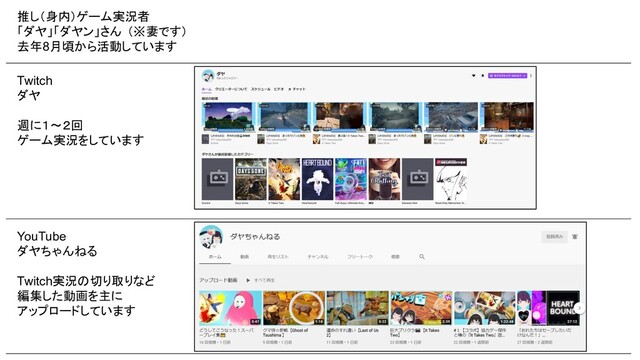 推し(身内)ゲーム実況者 「ダヤ」「ダヤン」さん (※妻です) 去年8月頃から活動しています Twitch ダヤ 週に1~2回 ゲーム実況をしています YouTube ダヤちゃんねる