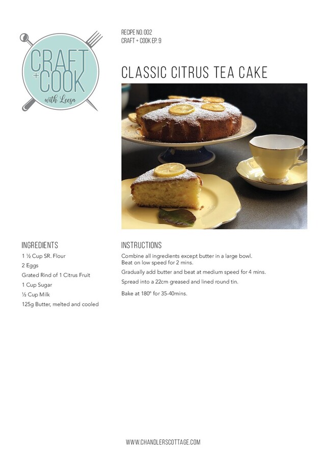 Combine all ingredients except butter in a large bowl. Beat on low speed for 2 mins. Gradually add butter and beat at medium speed for 4 mins. Spread into a 22cm greased and lined round tin. Bake at 180° for 35-40mins. Ingredients 1 ½ Cup SR. Flour 2 Eggs Grated Rind of 1 Citrus Fruit 1 Cup Sugar ½ Cup Milk 125g Butter, melted and cooled CLASSIC CITRUS TEA CAKE