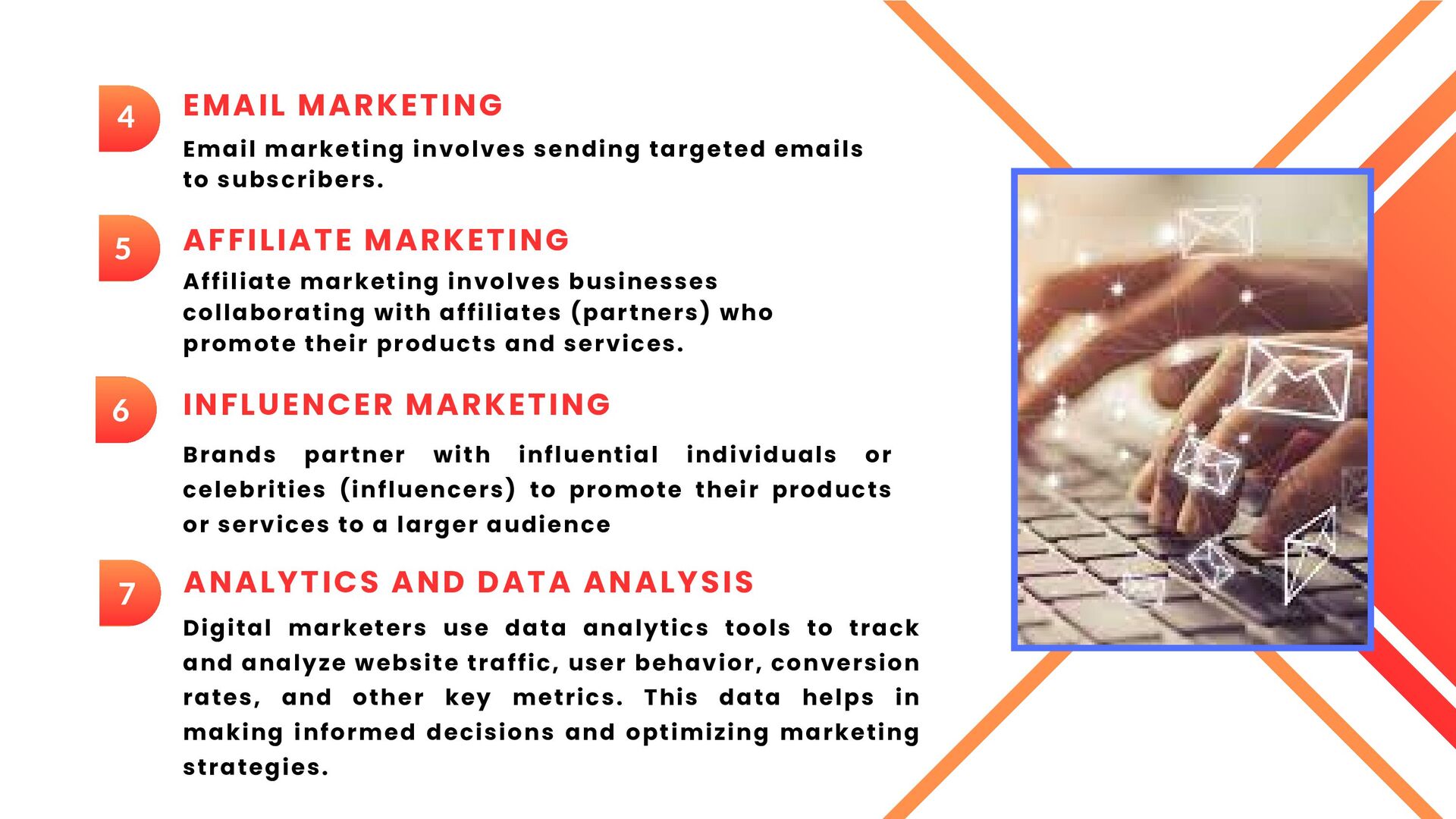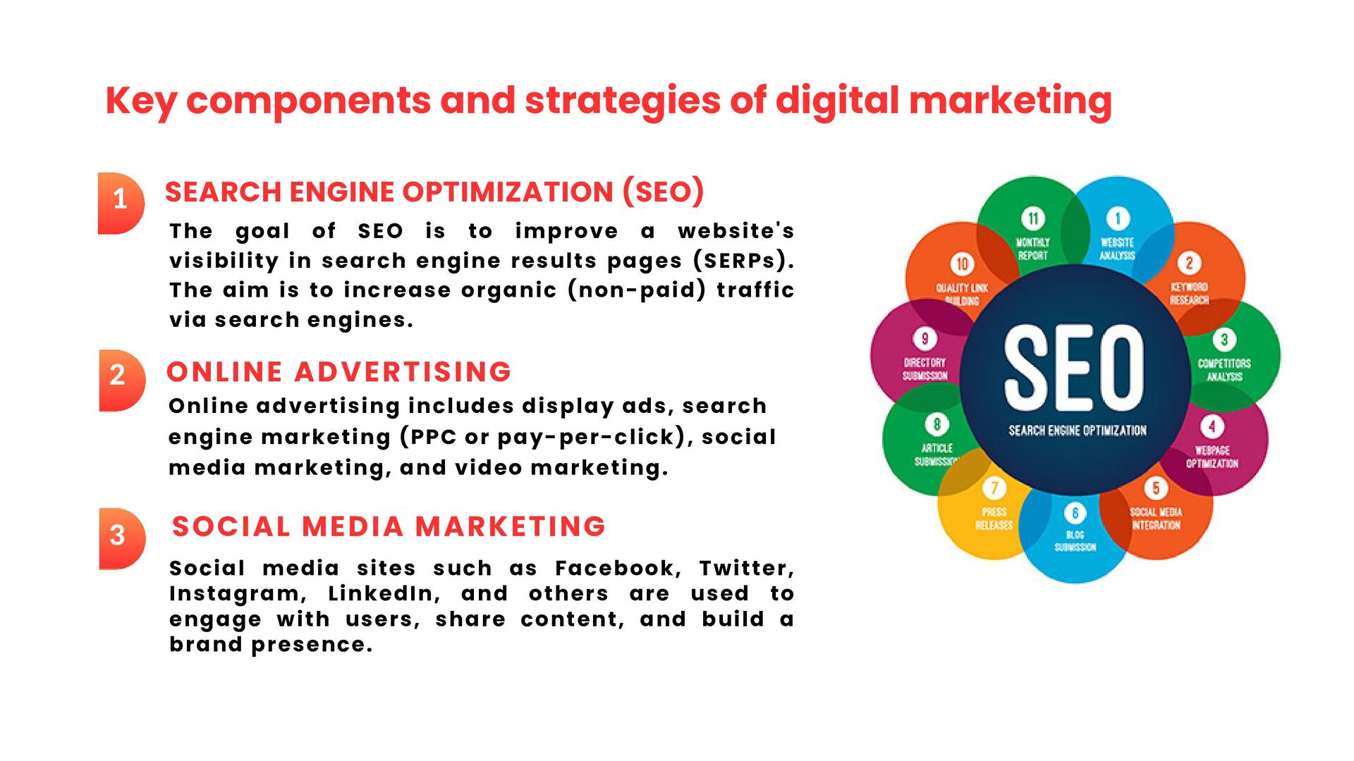 in search engine results pages (SERPs). The aim is to increase organic (non-paid) traffic via search engines. SEARCH ENGINE OPTIMIZATION (SEO) 1 Online advertising includes display ads, search engine marketing (PPC or pay-per-click), social media marketing, and video marketing. 2 ONLINE ADVERTISING Social media sites such as Facebook, Twitter, Instagram, LinkedIn, and others are used to engage with users, share content, and build a brand presence. 3 SOCIAL MEDIA MARKETING Key components and strategies of digital marketing