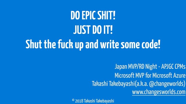 Shut the fuck up and write some code! Microsoft MVP for Microsoft Azure Takashi Takebayashi(a.k.a. @changeworlds) www.changesworlds.com Japan MVP/RD Night - APJGC CPMs