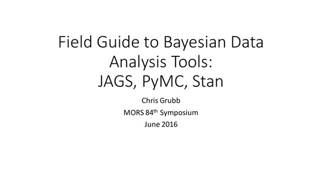 to PyMC3, Stan, and JAGS pages • Dr. Kathryn Laskey (GMU) posts the slides and assignments for her entire course on Bayesian Inference and Decision Theory (<-- great course!) • Dr. Andrew Gelman’s blog (see e.g. post on Stan and PyMC) • The Stan Google Group is a treasure trove of discussions on not only Stan, but Bayesian modeling in general. Also, core developers and other experts are very engaging and willing to answer questions! • Dr. Thomas Twiecki (Quantopian, key contributor to PyMC3) has a great blog with examples of PyMC3 implementations • Duke offers a course in Computational Statistics based in Python, which has nice resources to Python stats, PyMC 2 and 3, and adjacent projects • Bayesian Methods for Hackers: a popular introduction to Bayesian methods • Martyn Plummer’s JAGS News blog