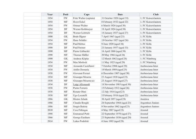 Paulo 1994 FW Müller 31 January 1966 (aged 28) São Paulo 2002 GK Rogério Ceni 22 January 1973 (aged 29) São Paulo 1994 GK Zetti 10 January 1965 (aged 29) São Paulo 2014 DF Matthias Ginter 19 January 1994 (aged 20) SC Freiburg 2014 DF Benedikt Höwedes 29 February 1988 (aged 26) Schalke 04 1974 DF Helmut Kremers 24 March 1949 (aged 25) Schalke 04 2014 MF Julian Draxler 20 September 1993 (aged 20) Schalke 04 1974 GK Norbert Nigbur 8 May 1948 (aged 26) Schalke 04 2010 MF Jesús Navas 21 November 1985 (aged 24) Sevilla 2018 MF Steven Nzonzi 15 December 1988 (aged 29) Sevilla 1966 GK Ron Springett 22 July 1935 (aged 30) Sheffield Wednesday 1994 DF Ronaldão 19 June 1965 (aged 28) Shimizu S-Pulse 1966 FW Terry Paine 23 March 1939 (aged 27) Southampton 1954 DF Herbert Erhardt 6 July 1930 (aged 23) SpVgg Fürth 1954 MF Karl Mai 27 July 1928 (aged 25) SpVgg Fürth 1978 MF José Daniel Valencia 3 October 1955 (aged 22) Talleres de Córdoba 1978 DF Luis Galván 24 February 1948 (aged 30) Talleres de Córdoba 1978 MF Miguel Oviedo 12 October 1950 (aged 27) Talleres de Córdoba 1982 MF Giuseppe Dossena 2 May 1958 (aged 24) Torino 2018 GK Hugo Lloris (captain) 26 December 1986 (aged 31) Tottenham Hotspur 1966 FW Jimmy Greaves 20 February 1940 (aged 26) Tottenham Hotspur 1938 MF Bruno Chizzo 19 April 1916 (aged 22) Triestina 1938 FW Gino Colaussi 4 March 1914 (aged 24) Triestina 1938 FW Pietro Pasinati 21 July 1910 (aged 27) Triestina 1982 FW Franco Causio 1 February 1949 (aged 33) Udinese 2006 FW Vincenzo Iaquinta 21 November 1979 (aged 26) Udinese 2010 DF Carlos Marchena 31 July 1979 (aged 30) Valencia 2010 MF David Silva 8 January 1986 (aged 24) Valencia 2010 FW David Villa 3 December 1981 (aged 28) Valencia