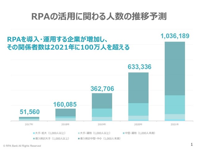 2020年 2021年 大手・拡大(1,000人以上) 大手・運用(1,000人以上) 中堅・運用(1,000人未満) 導入検討大手(1,000人以上) 導入検討中堅・中小(1,000人未満) 51,560 160,085 362,706 633,336 1,036,189 RPAの活用に関わる人数の推移予測 RPAを導入・運用する企業が増加し、 その関係者数は2021年に100万人を超える