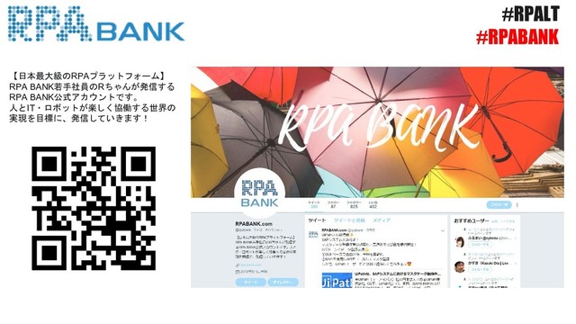 #RPALT #RPABANK 【日本最大級のRPAプラットフォーム】 RPA BANK若手社員のRちゃんが発信する RPA BANK公式アカウントです。 人とIT・ロボットが楽しく協働する世界の 実現を目標に、発信していきます!