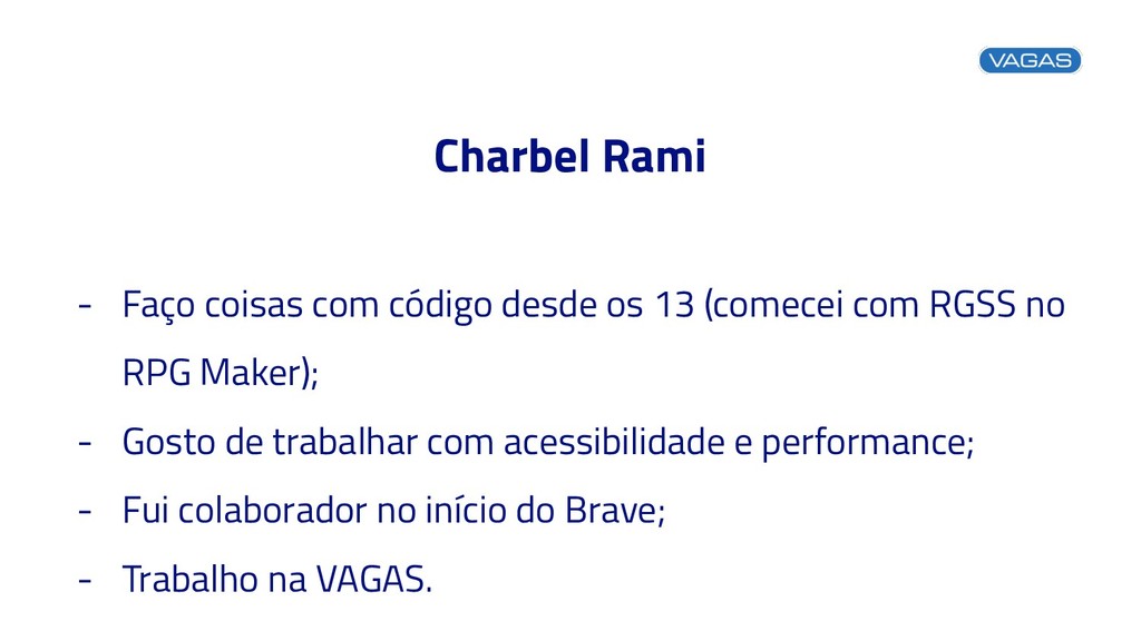 (comecei com RGSS no RPG Maker); - Gosto de trabalhar com acessibilidade e performance; - Fui colaborador no início do Brave; - Trabalho na VAGAS.