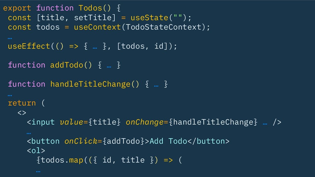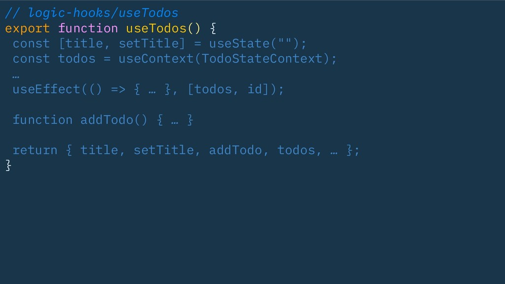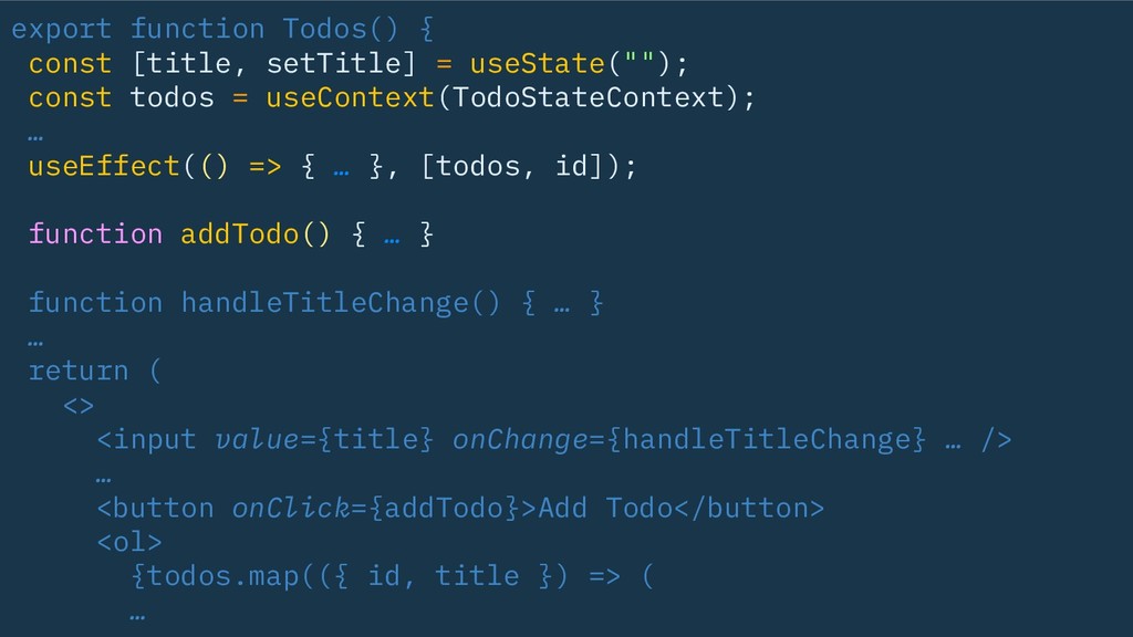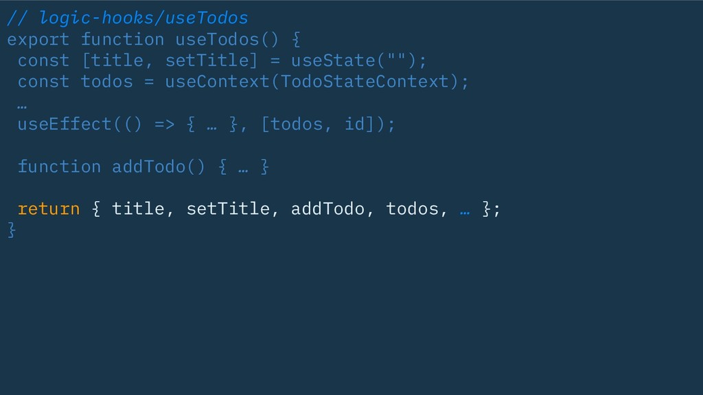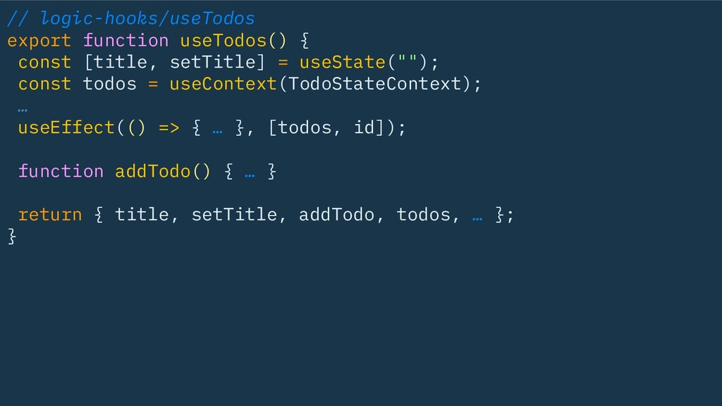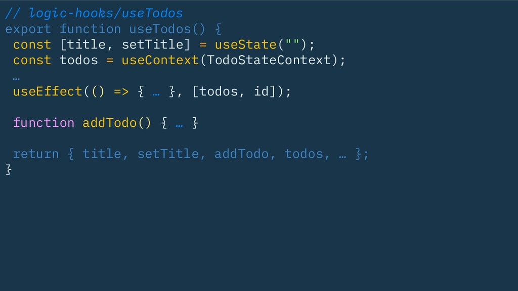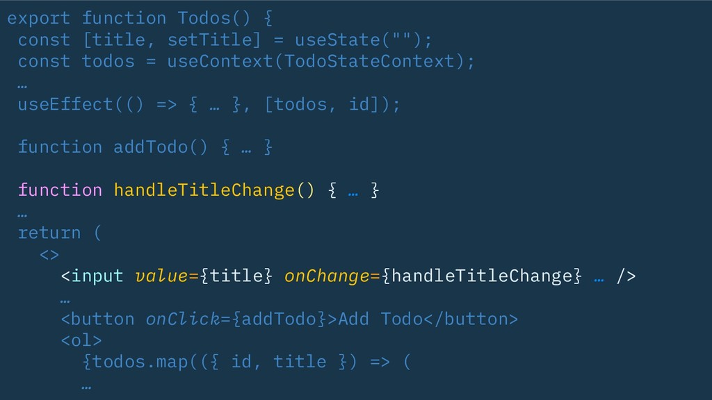 useState(""); const todos = useContext(TodoStateContext); … useEffect(() => { … }, [todos, id]); function addTodo() { … } return { title, setTitle, addTodo, todos, … }; }