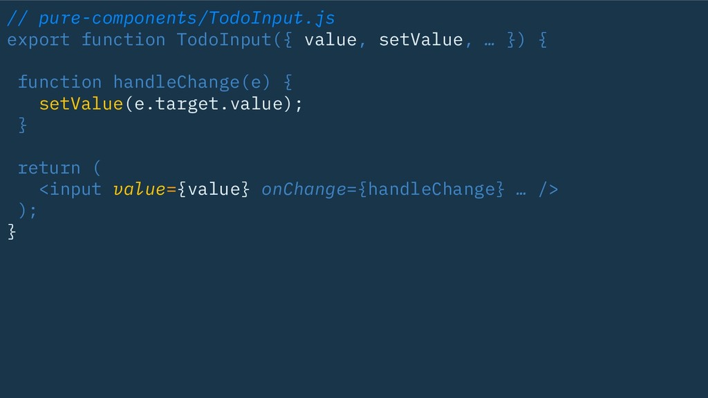// pure-components/TodoInput.js export function TodoInput({ value, setValue, … }) {
