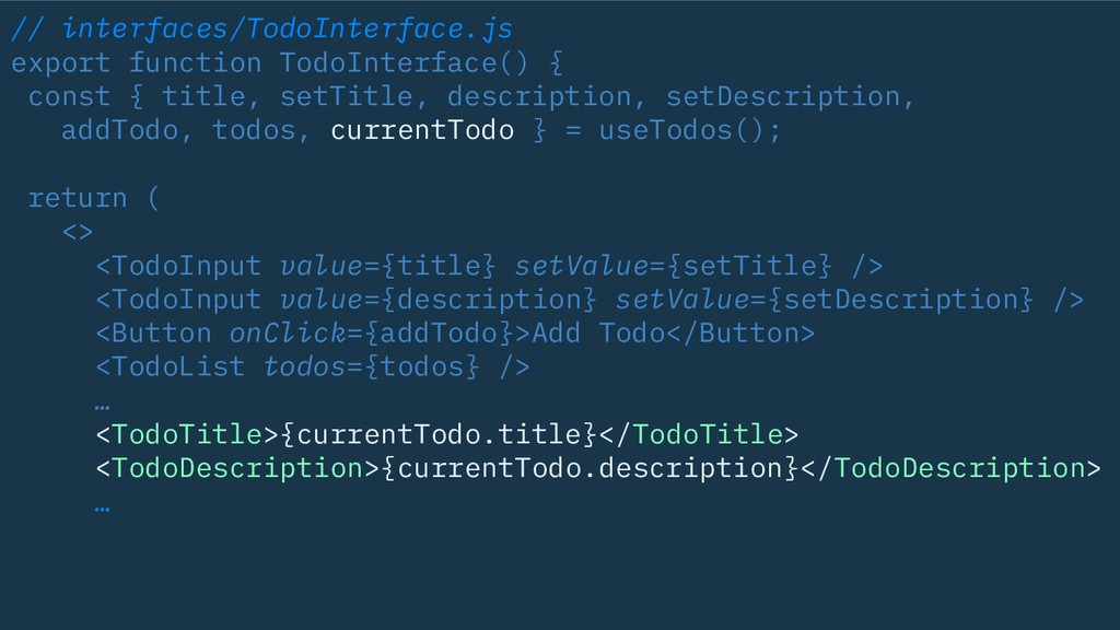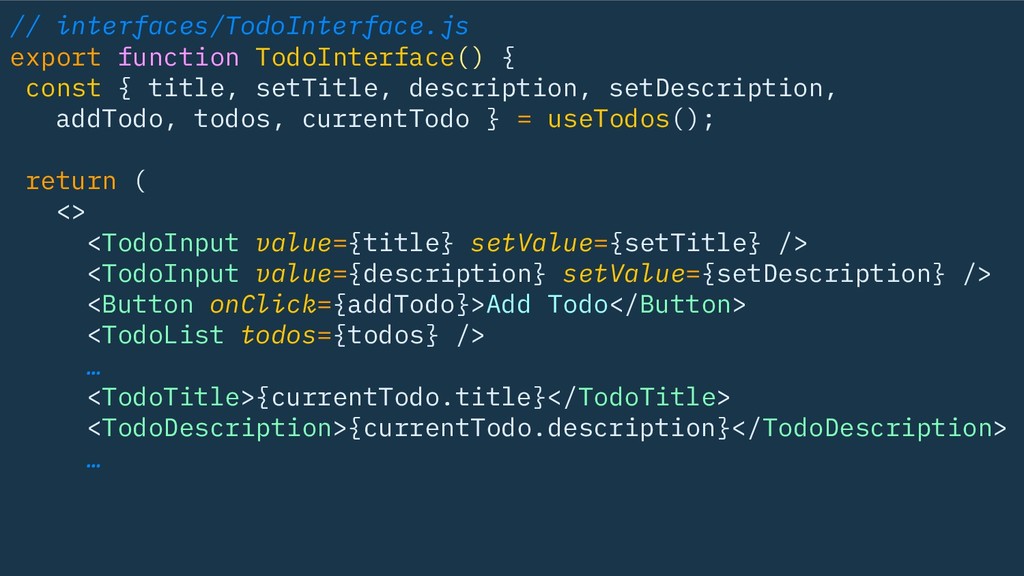description, setDescription, addTodo, todos, currentTodo } = useTodos(); return ( <> <TodoInput value={title} setValue={setTitle} /> <TodoInput value={description} setValue={setDescription} /> <Button onClick={addTodo}>Add Todo</Button> <TodoList todos={todos} /> … <TodoTitle>{currentTodo.title}</TodoTitle> <TodoDescription>{currentTodo.description}</TodoDescription> …