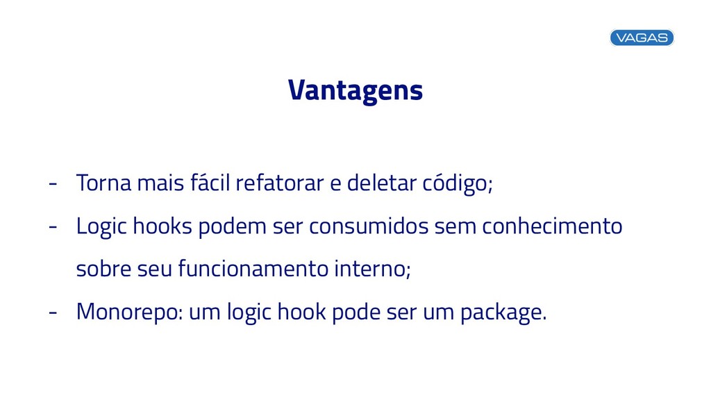 Logic hooks podem ser consumidos sem conhecimento sobre seu funcionamento interno; - Monorepo: um logic hook pode ser um package.