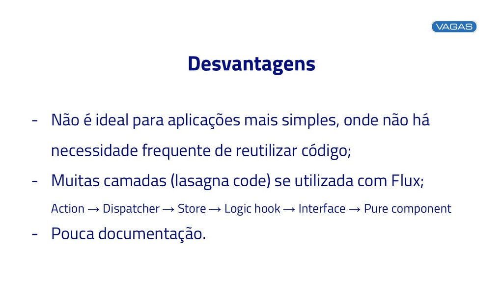 não há necessidade frequente de reutilizar código; - Muitas camadas (lasagna code) se utilizada com Flux; Action → Dispatcher → Store → Logic hook → Interface → Pure component - Pouca documentação.