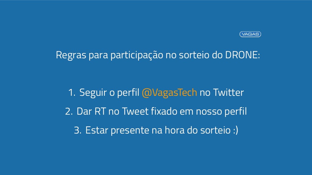 perfil @VagasTech no Twitter 2. Dar RT no Tweet fixado em nosso perfil 3. Estar presente na hora do sorteio :)