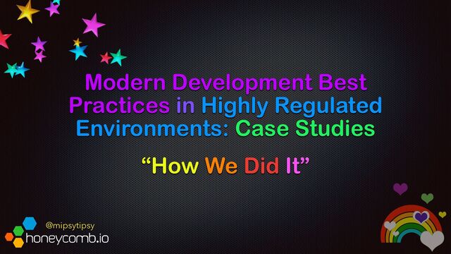 I gave a talk at Fintech Devcon in August 2023 on why "Modern Development Best Practices Are Not Incompatible With Highly Regulated Environments." Since then I have been compiling a list of case studies of companies in regulated domains (health care, security, etc) who are practicing Continuous Deployment, observability-driven development, and other modern practices that combine to radically accelerate delivery via fast feedback loops. If you would like to add your company to the list, please get in touch!! Contact info on the last slide.