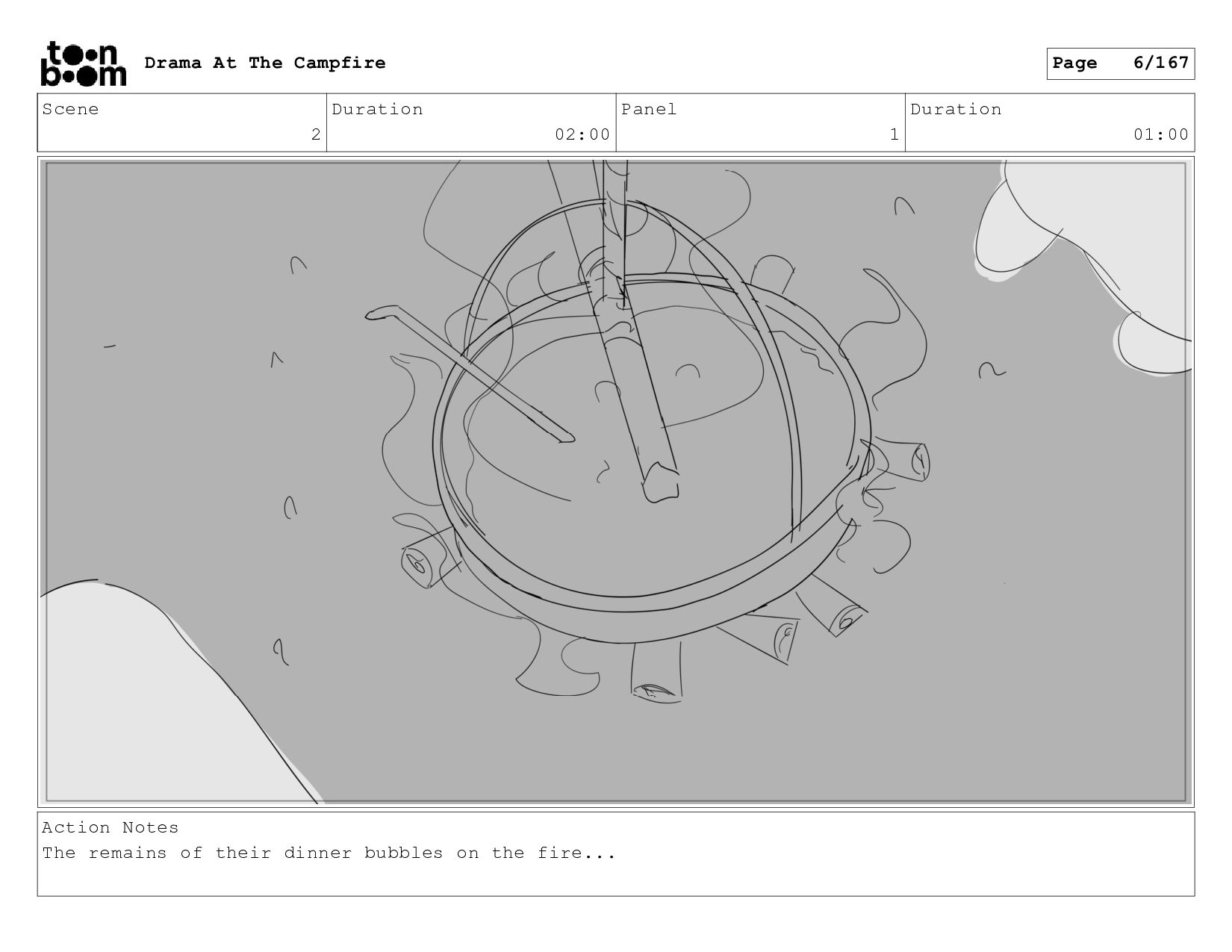 The remains of their dinner bubbles on the fire... Drama At The Campfire Page 6/167