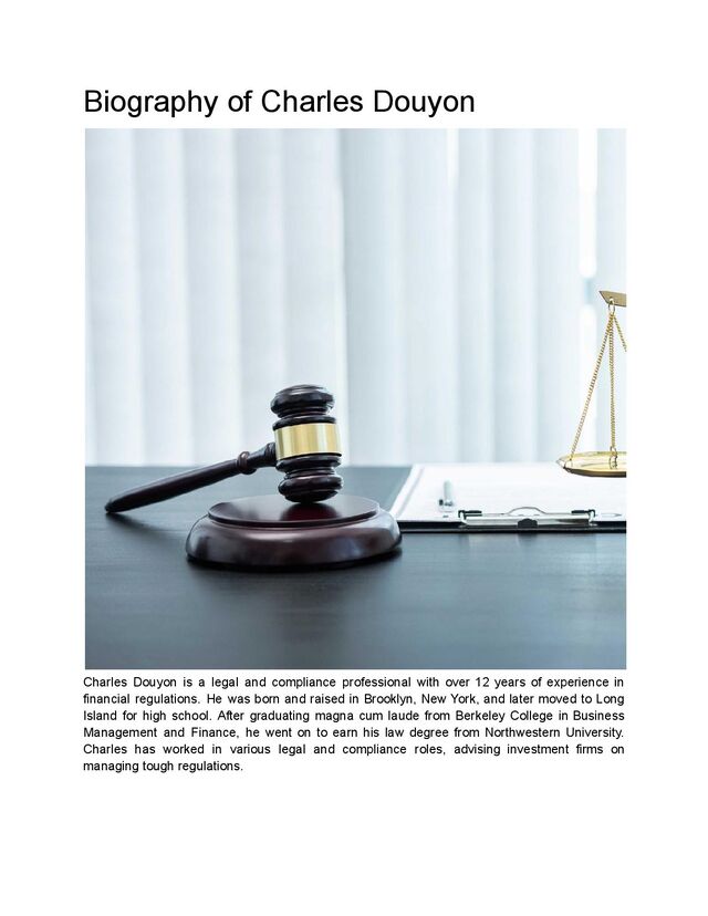 in Brooklyn, New York. When he reached high school, his family decided to move to Long Island. During his time in high school, Charles's passion for sports grew. He played basketball and football and was a well-rounded athlete. After high school, Charles decided to pursue higher education at Northeastern University in Boston. However, shortly after beginning his college studies, Charles transferred to Berkeley College in New York. The tragic events of September 11, 2001, led him to reconsider his priorities, and being closer to family seemed important during such a difficult time. He continued pursuing his major in Business Management and Finance at Berkeley College. In 2005, Charles graduated magna cum laude, marking the beginning of a successful career in both business and law. Wall Street and Transition to Law School Following his graduation, Charles ventured into finance, landing a position at a financial institution on Wall Street. The experience of working in such a high-pressure environment was eye-opening. Charles learned valuable skills in finance, investment strategies, and business operations. However, after a few years, Charles realized his interests were shifting. While he enjoyed working in finance, he felt drawn to the legal aspects of the industry. In 2007, Charles decided to make a significant career shift. He left his position on Wall Street and enrolled at Northwestern University School of Law to pursue a law degree. Law school was a new challenge for Charles, requiring him to adopt a different way of thinking and problem-solving. His experience in both finance and business management helped him see financial law from a different angle and made it easier for him to tackle its complexities.